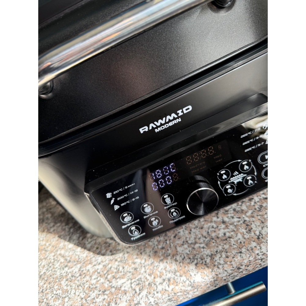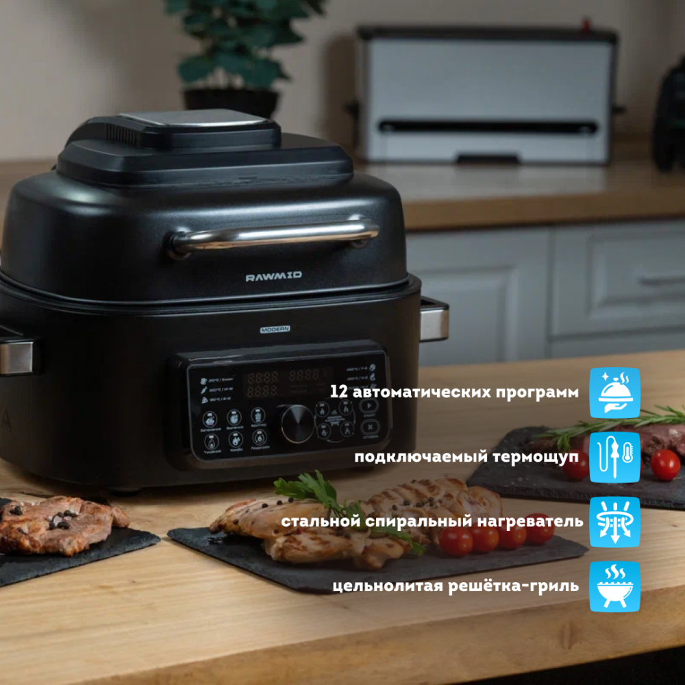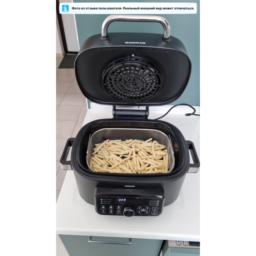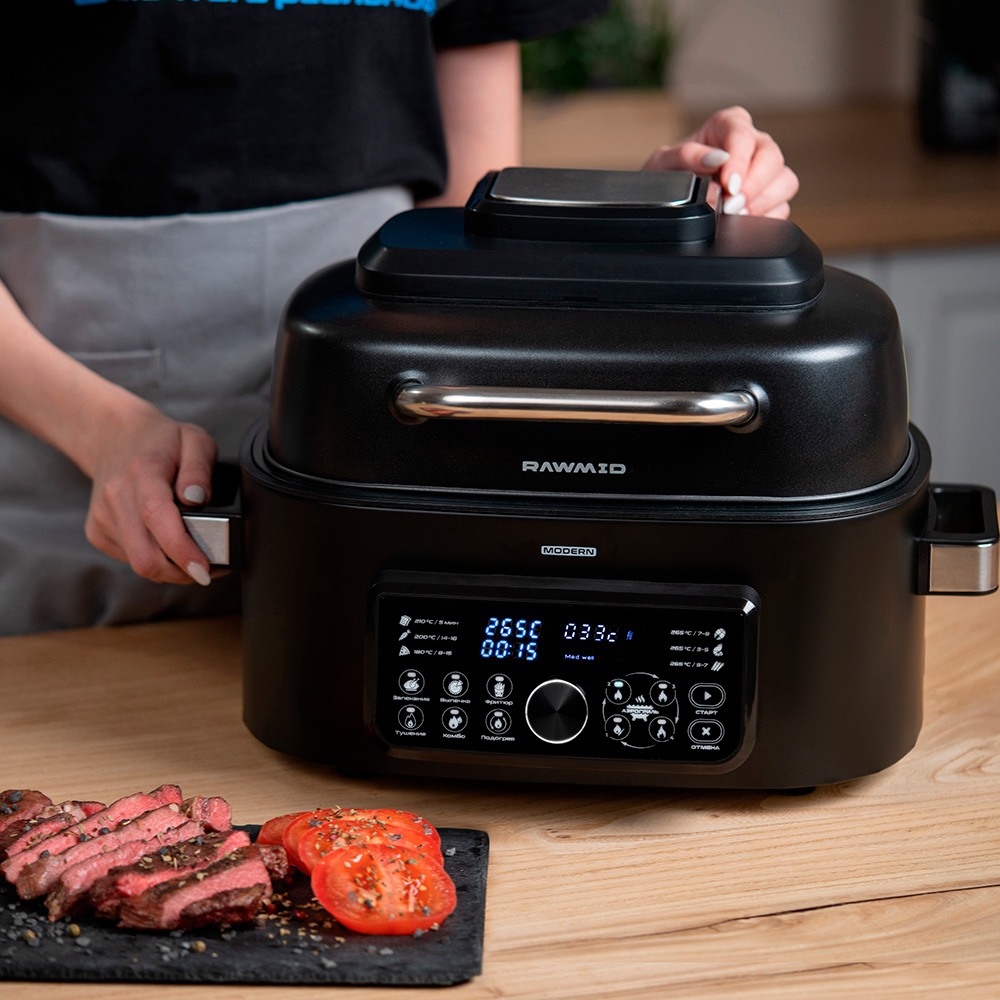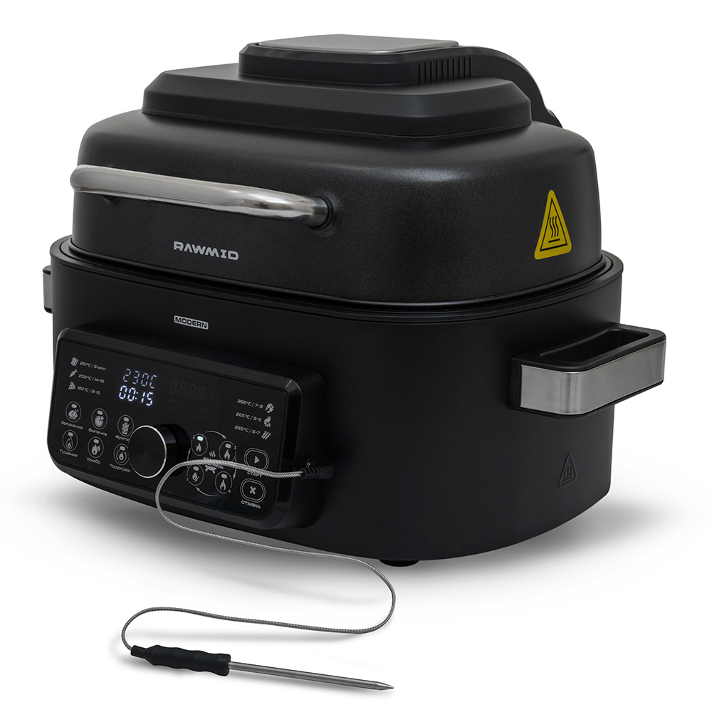 В отличие от контактных грилей, в аэрогриле RAWMID Modern продукты обжариваются потоками раскалённого воздуха, благодаря чему они не сгорят даже если их немного передержать. Вам не придётся быть экспертом в готовке и замерять время с точностью до секунды. Забудьте об опасениях пережарить и сжечь блюдо — просто наслаждайтесь процессом приготовления.
