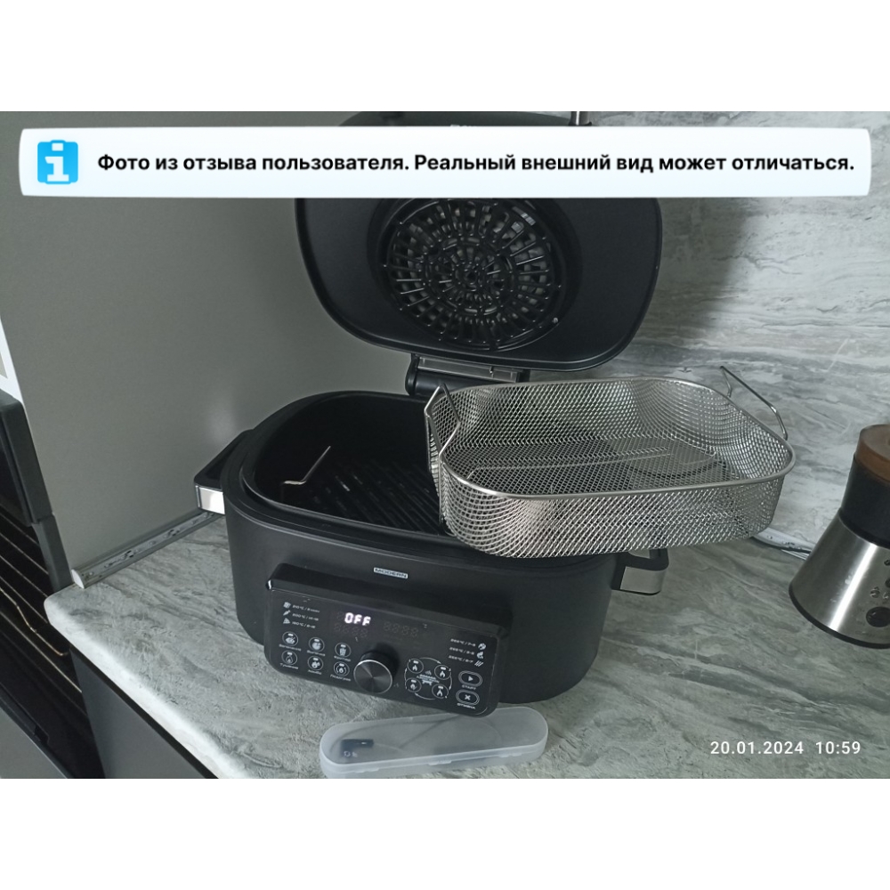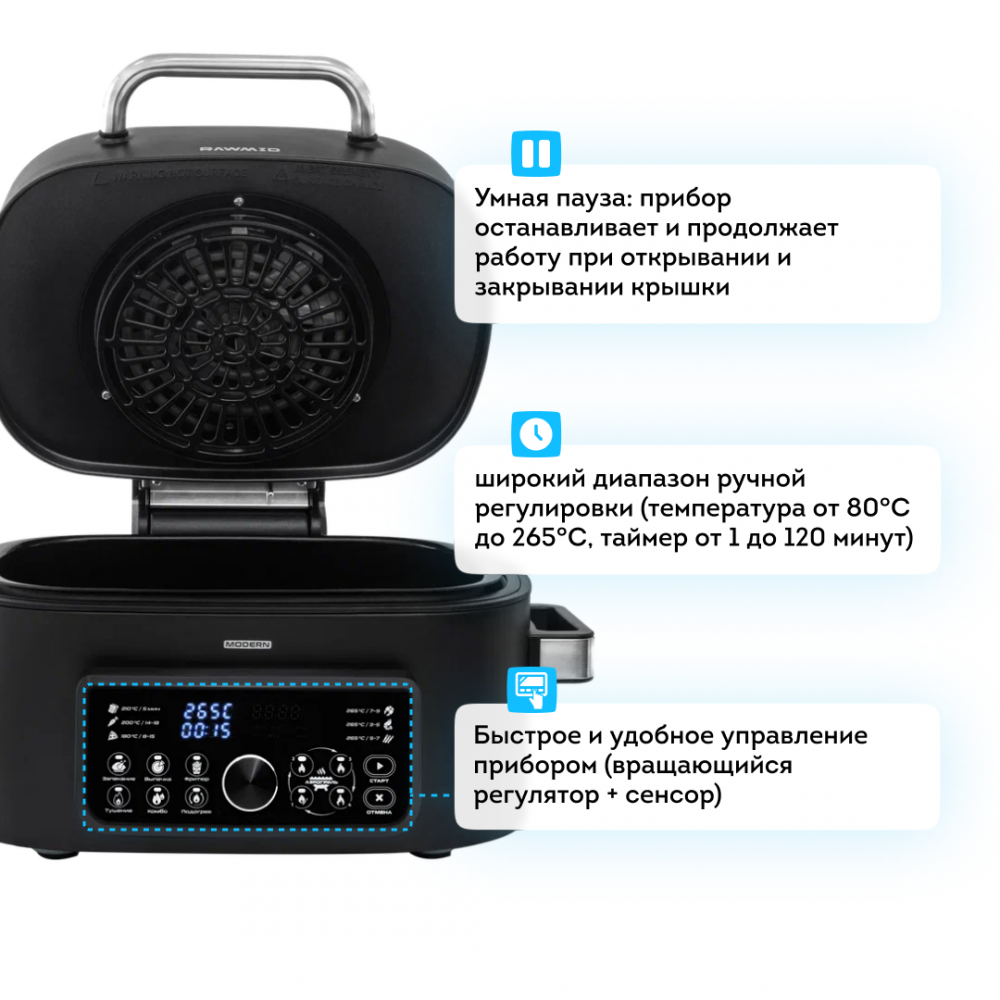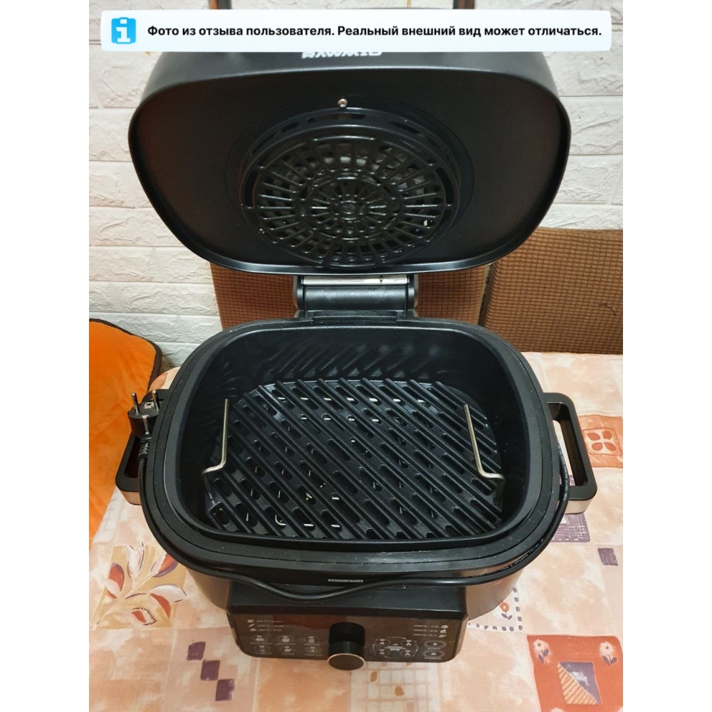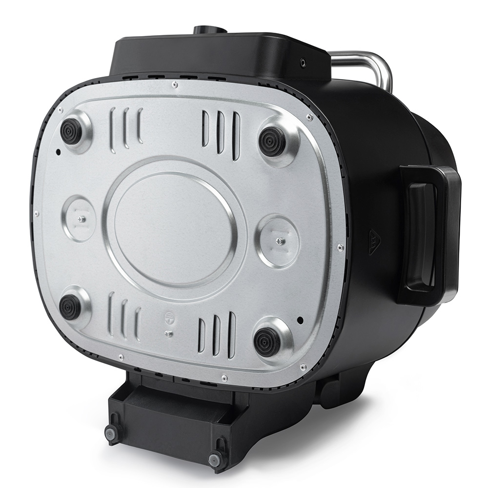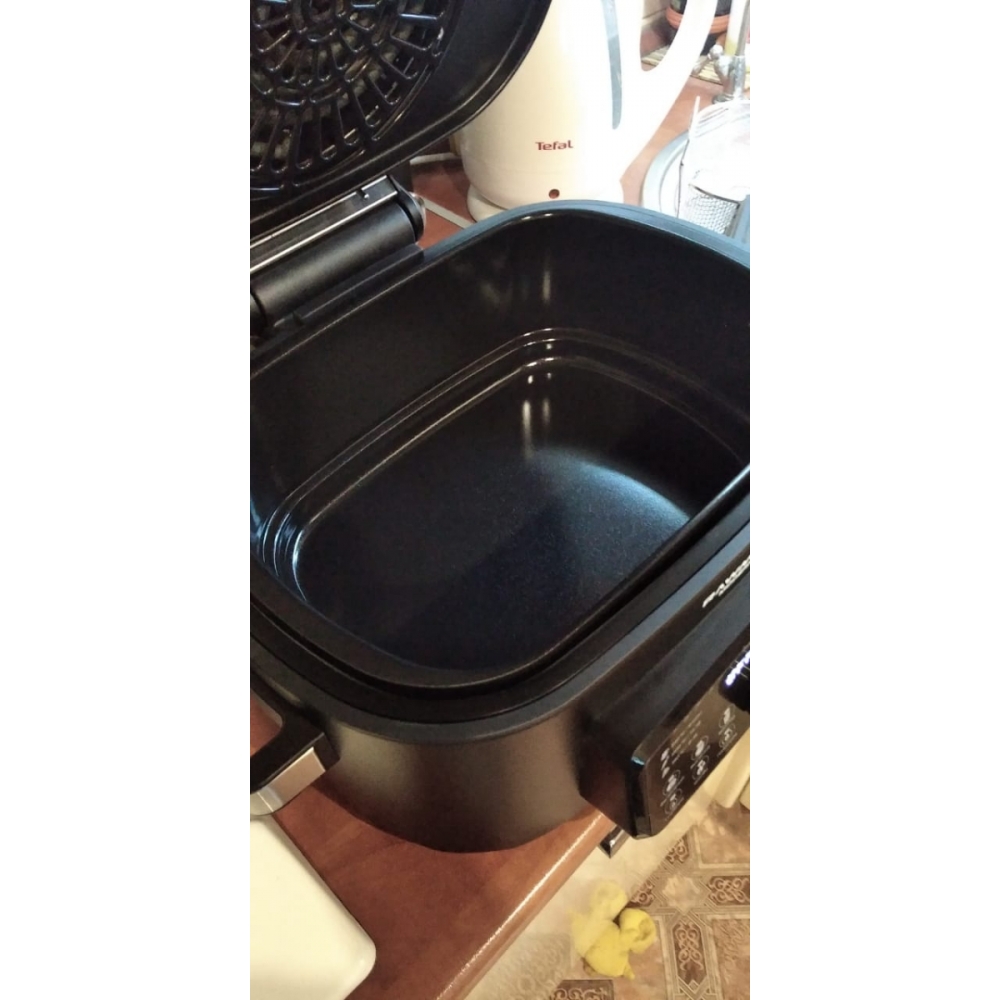 Большой многолопастной вентилятор, расположенный в верхней крышке устройства, сквозная решётка-гриль и обтекаемая форма чаши для запекания обеспечивают мощный и равномерный со всех сторон 3D-обдув продуктов для их равномерной обработки горячим воздухом.