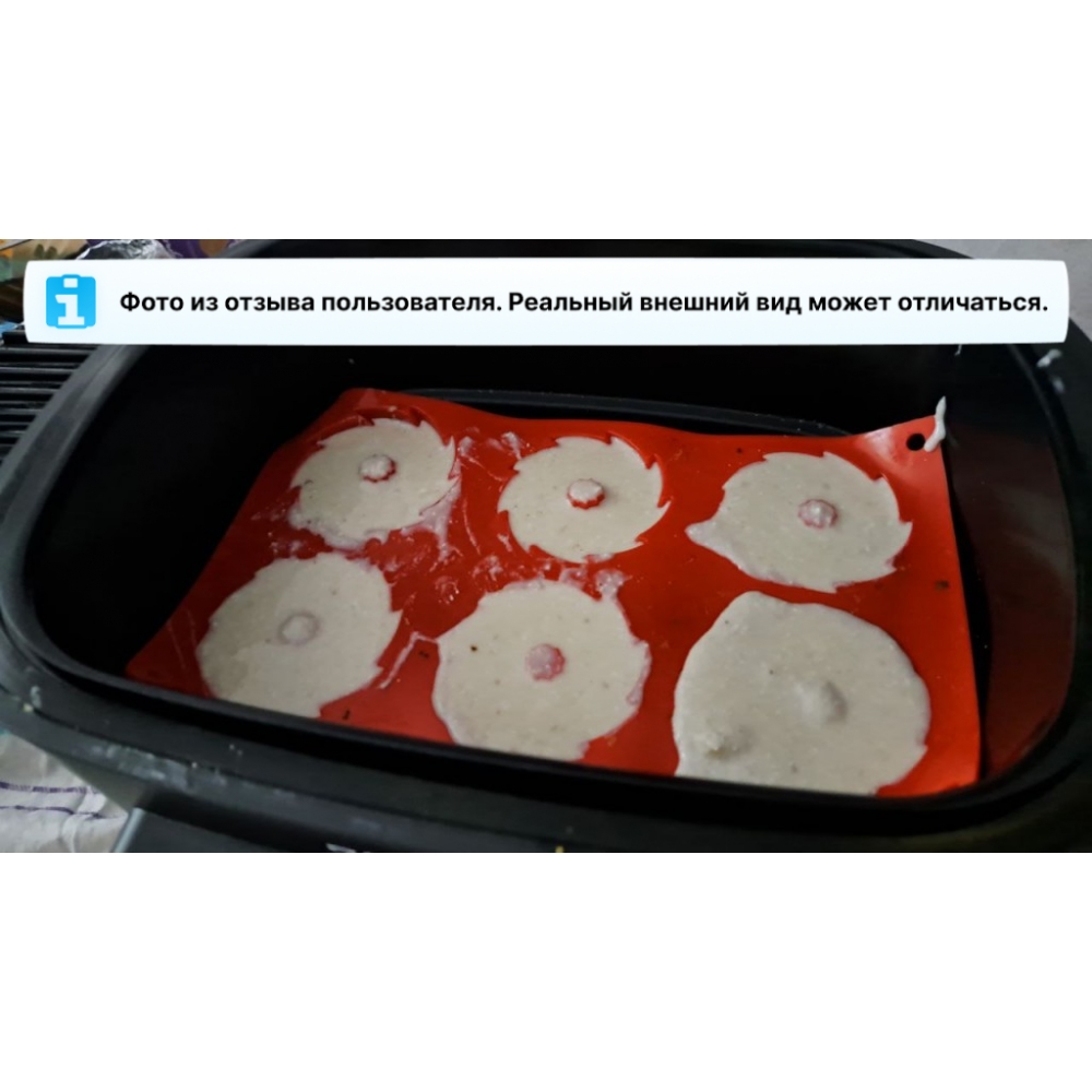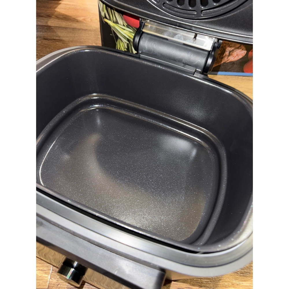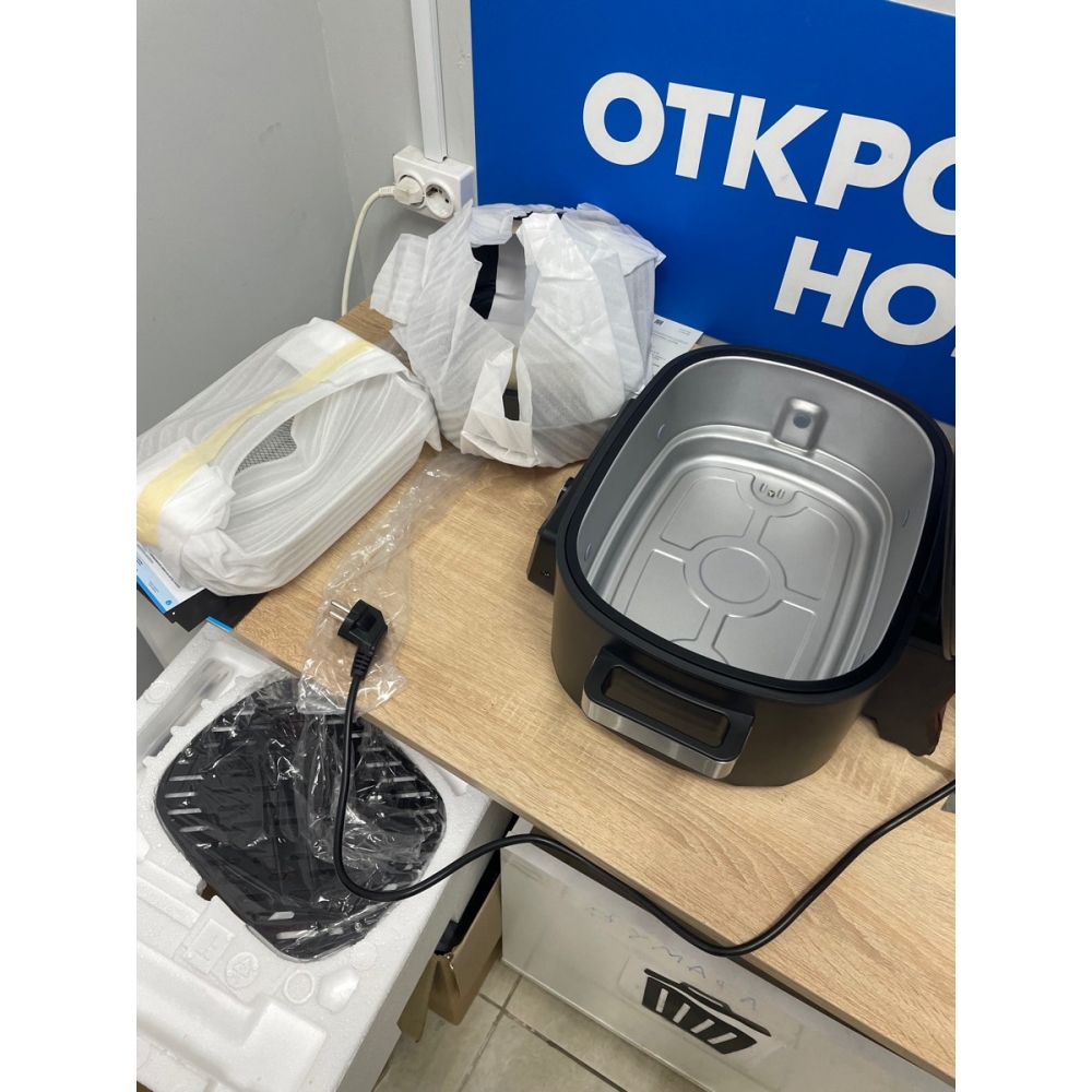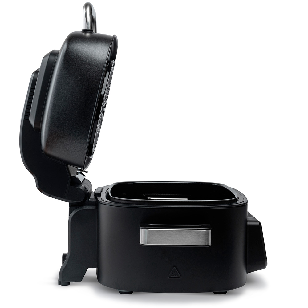 Большой многолопастной вентилятор, расположенный в верхней крышке устройства, сквозная решётка-гриль и обтекаемая форма чаши для запекания обеспечивают мощный и равномерный со всех сторон 3D-обдув продуктов для их равномерной обработки горячим воздухом.