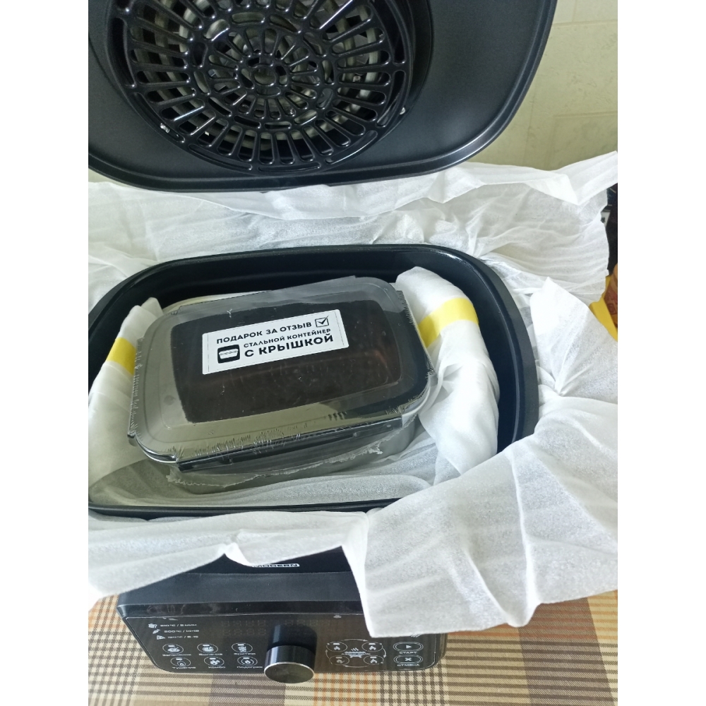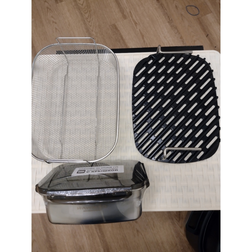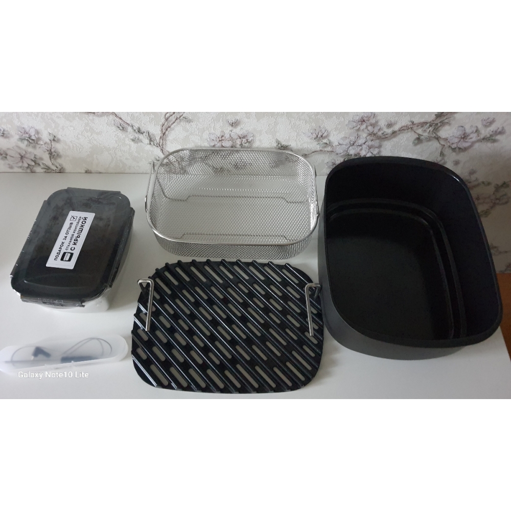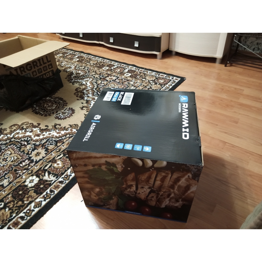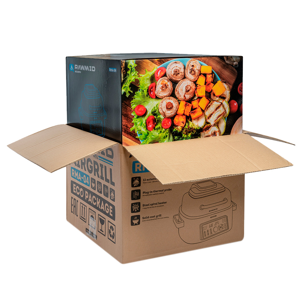 Аэрогриль упакован в двойную коробку. Внутренняя — подарочная, с красивым фирменным дизайном. Внешняя — обеспечивает дополнительную защиту во время перевозки.