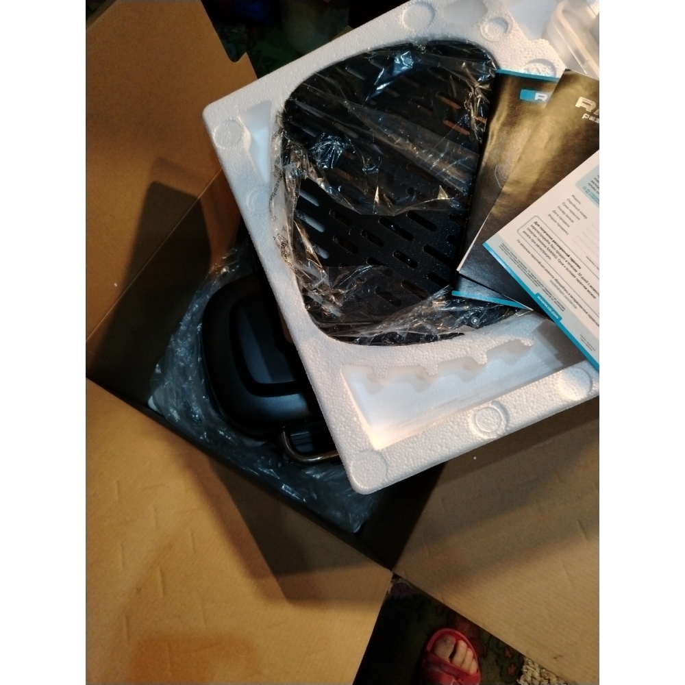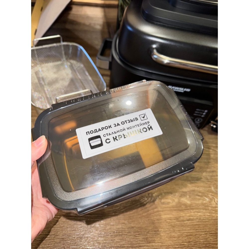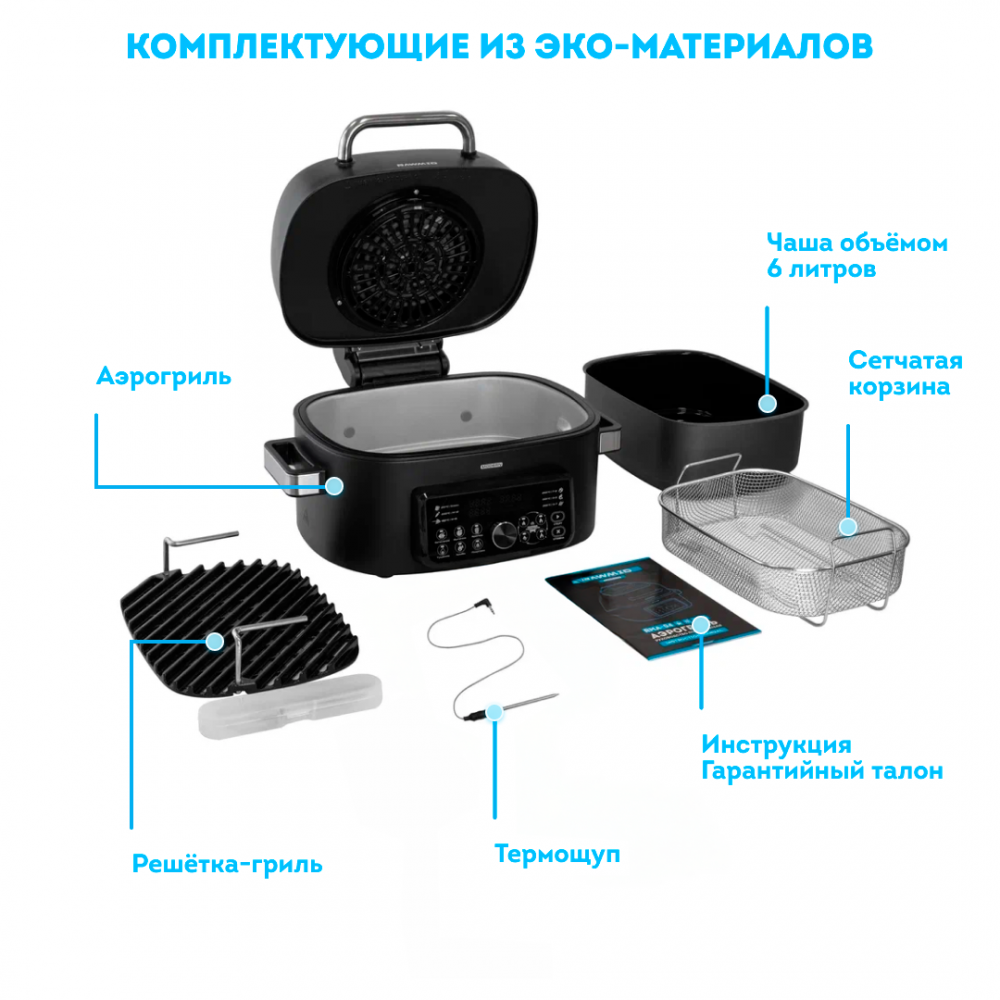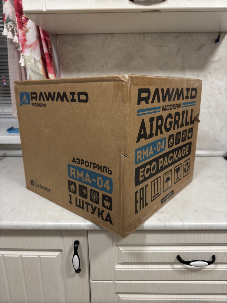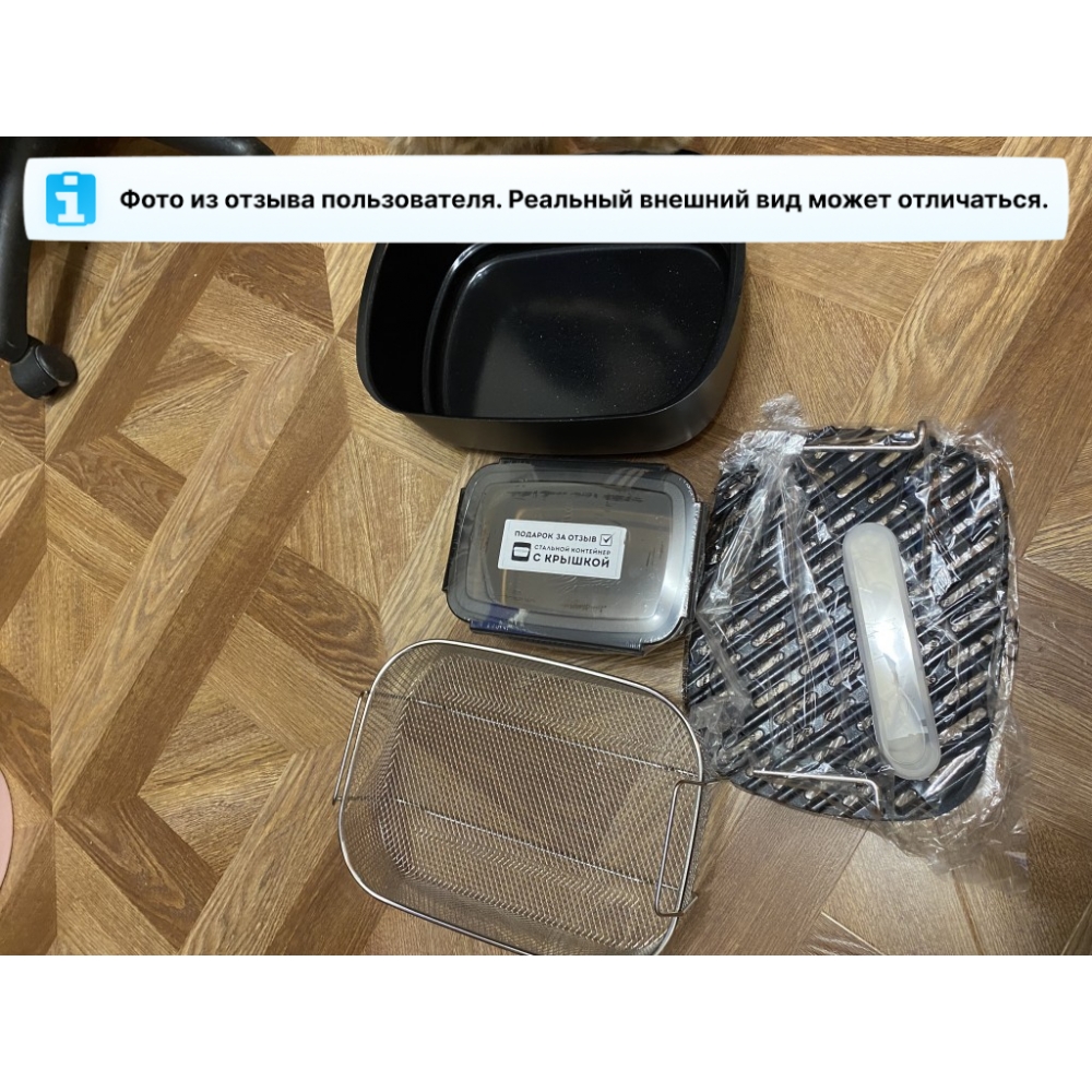 Аэрогриль упакован в двойную коробку. Внутренняя — подарочная, с красивым фирменным дизайном. Внешняя — обеспечивает дополнительную защиту во время перевозки.