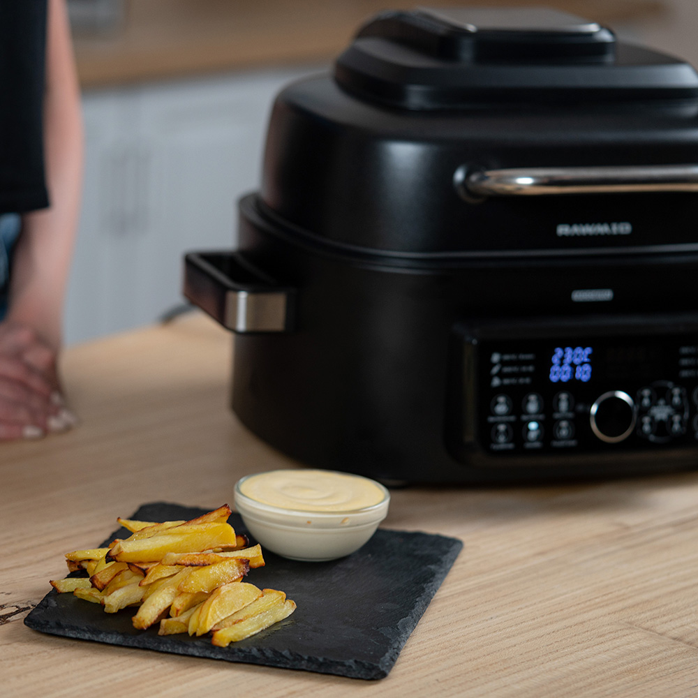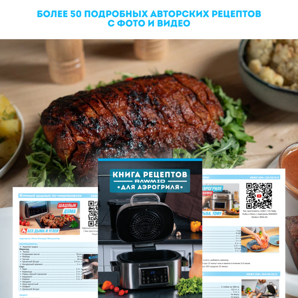 В аэрогриле RAWMID продукты обжариваются за счёт потоков горячего воздуха, поэтому в них можно добавлять меньше масла или вовсе не добавлять его, при этом блюда всё равно будут получаться поджаристыми, а значит вкусными и при этом ещё и более полезными.