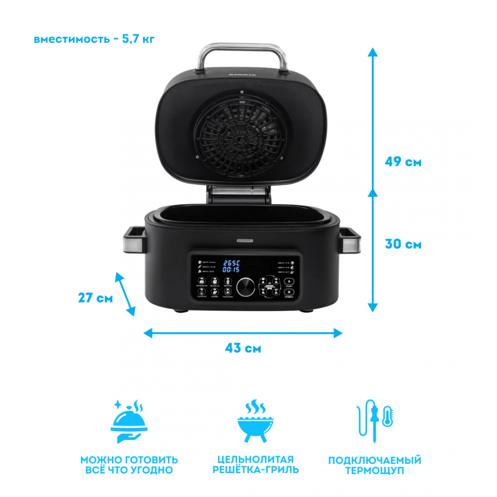 При низких температурах можно сушить овощи и фрукты или томить блюда. На высоких температурах можно жарить, тушить и запекать. Высокая граница температуры в 265°С позволяет использовать прибор как полноценную замену угольного или газового гриля, экспериментировать с привычными рецептами или открывать новые.