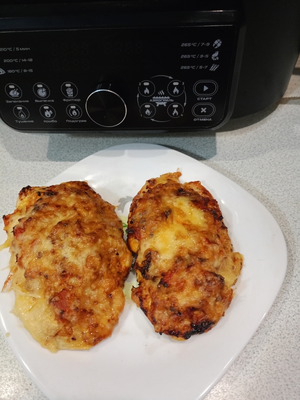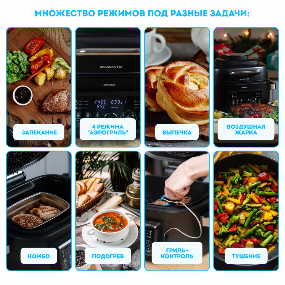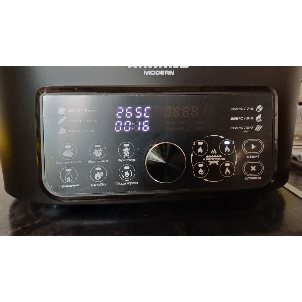 На Ваш выбор один из предустановленных режимов: запекание, выпечка, фритюр, тушение, комбо, подогрев, гриль-контроль, аэрогриль. В режиме аэрогриля можно выбрать 3 варианта: от не слишком жаркого до самого горячего (265°С). А при работе с термощупом можно выбрать одну из четырёх степеней прожарки. При желании, параметры для каждого режима можно скорректировать в зависимости от желаемого результата и объёма продуктов.