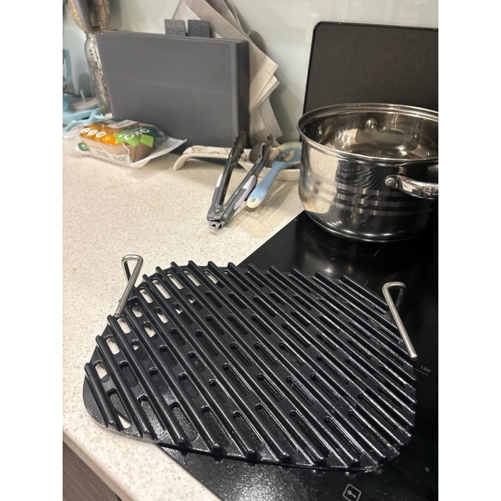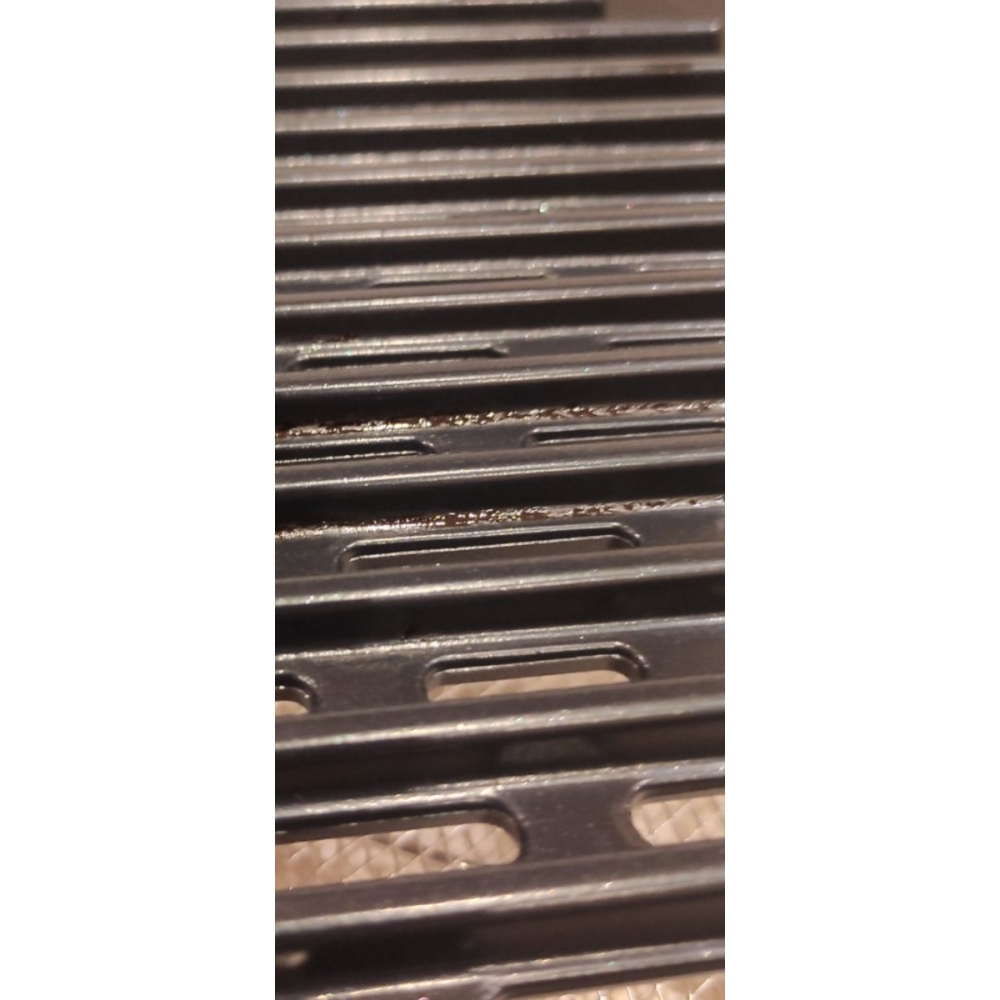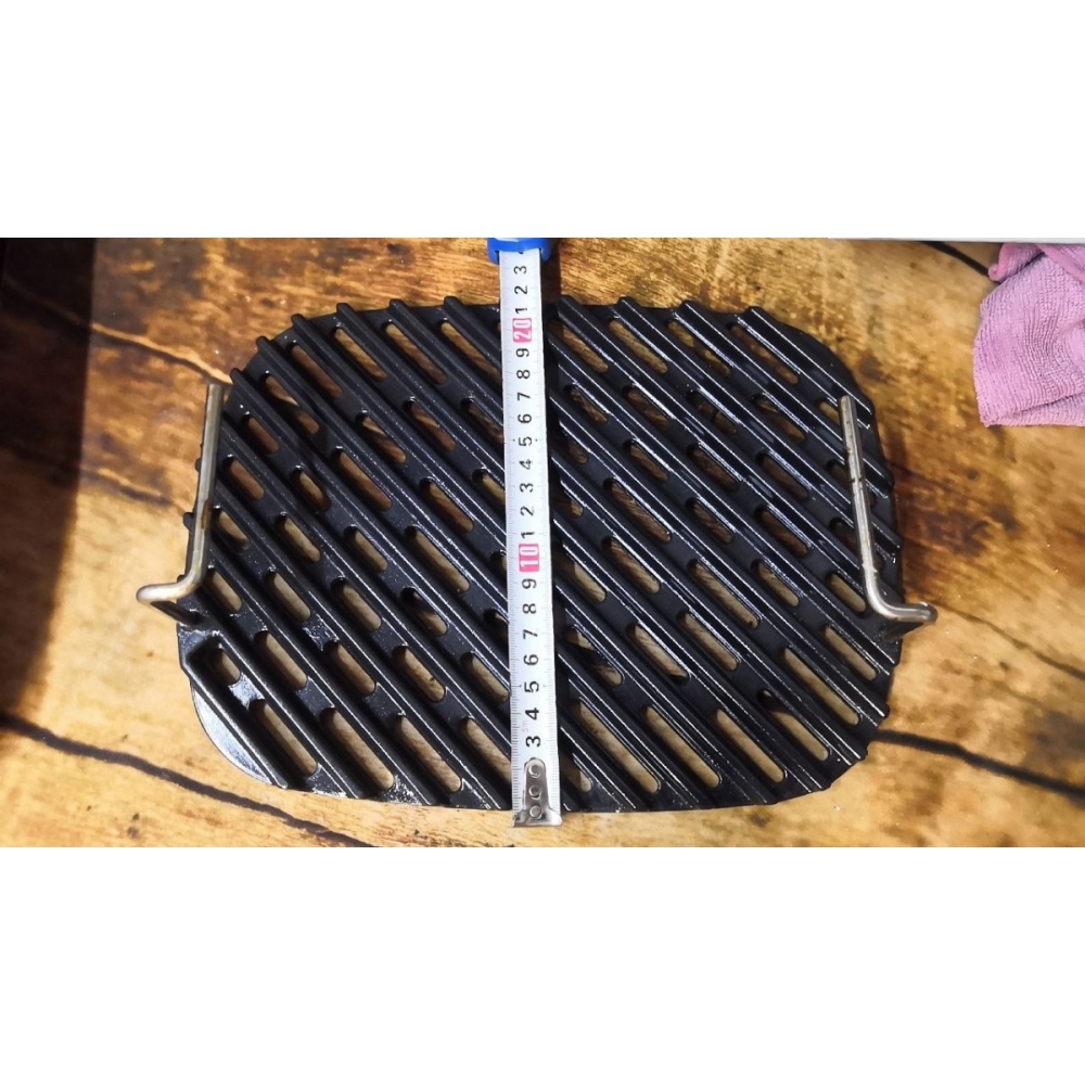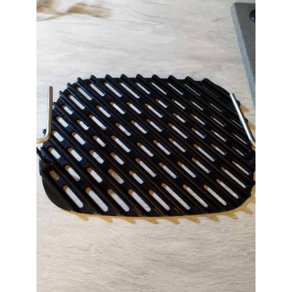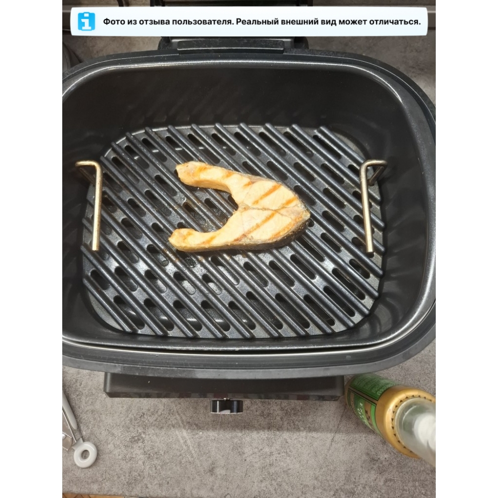 Рельефная решётка-гриль выполнена из цельного алюминиевого сплава, благодаря чему довольно лёгкая, но при этом обладает высокой прочностью и долгим сроком службы. Алюминиевая решётка не препятствует воздушному потоку и обладает высокой теплопроводностью, благодаря чему быстро нагревается в начале работы и быстро остывает по её окончании. Доставать решётку можно вместе с продуктами — благодаря съёмным ручкам по бокам. Поверхность имеет стойкое керамическое антипригарное покрытие, поэтому продукты не пригорают и не прилипают к поверхности, а саму решётку легко мыть.