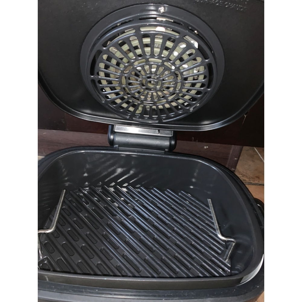 Прибор выполнен в форме прямоугольника с закруглёнными краями, что позволяет сочетать рациональное использование пространства с обтекаемой формой чаши для эффективной циркуляции воздуха. На корпусе размещены ручки, которые позволяют удобно открывать и закрывать крышку аэрогриля, а также легко перемещать его в другое место.