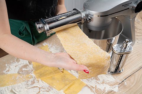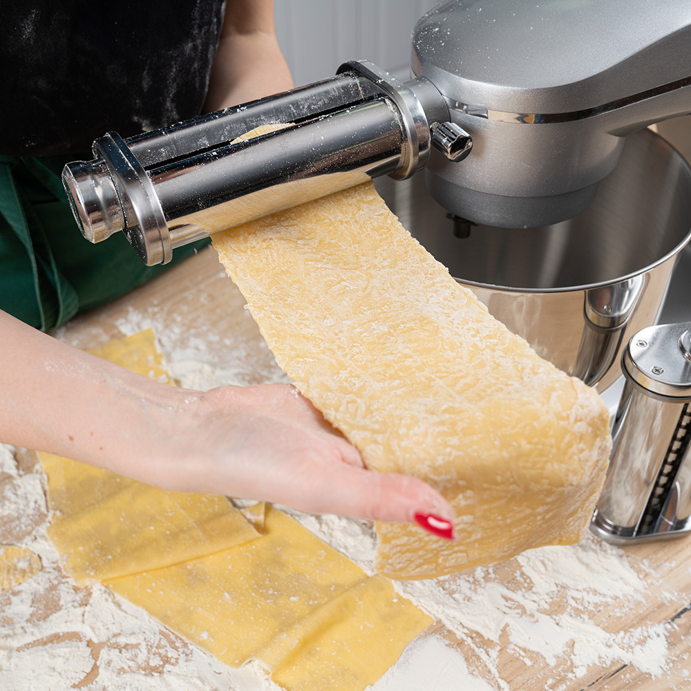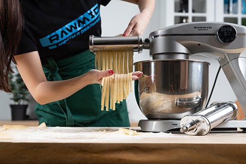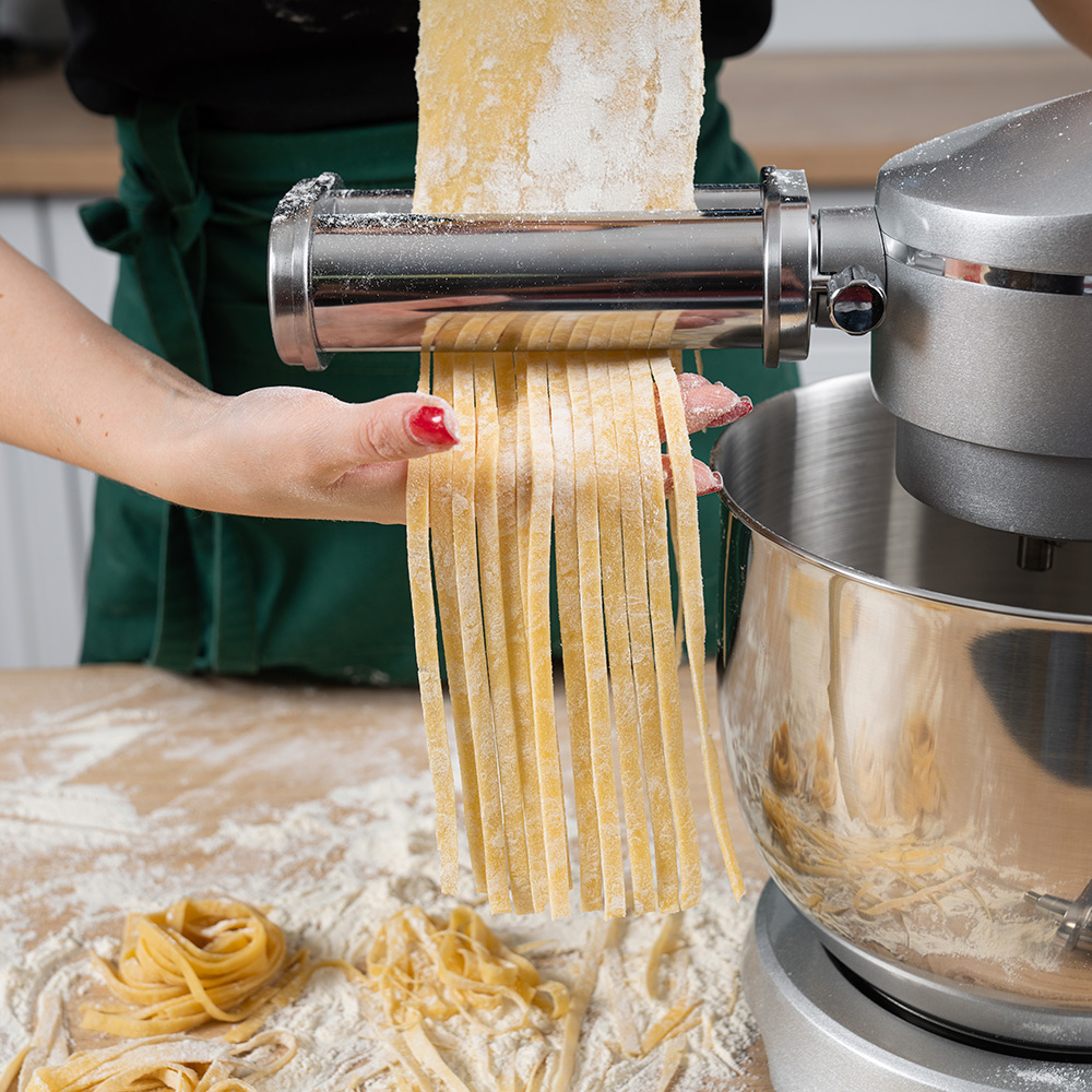 В комплект входит насадка для приготовления пасты фетучини — она получается в виде ленты шириной ~7 мм. Идеально подойдёт для приготовления итальянского блюда в вашей уникальной интерпретации, например, из цельнозерновой, гречневой или рисовой муки. Также вы сможете сделать разноцветную пасту для детей или добавить любимые специи прямо в пасту, чтобы сделать её ещё вкуснее.