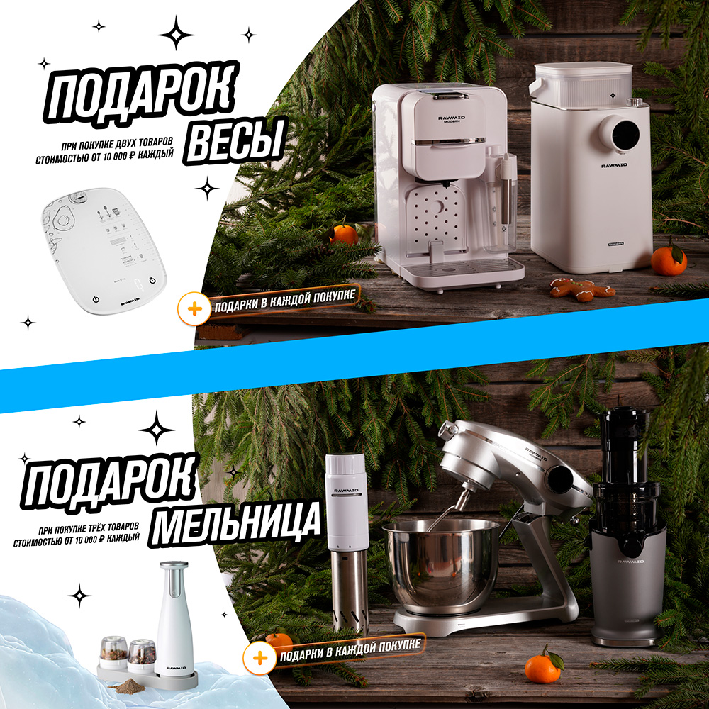RAWMID дарит скидки на всю лучшую технику: высокомощные блендеры, дегидраторы с равномерной сушкой, соковыжималки бережного отжима, аэрофритюры и печи, очистители и увлажнители воздуха и многое другое.