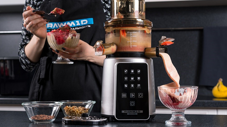Для техники RAWMID нет ничего невозможного. В комплект шнековых соковыжималок RAWMID Vitamin и Modern входит специальная насадка для приготовления холодных десертов.