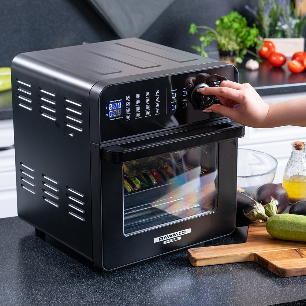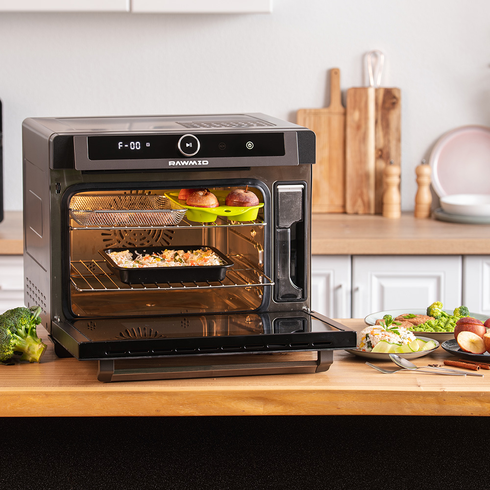 Если классический аэрогриль — это разумная и полезная кухонная техника, то RAWMID Future RFM-01 — это уже полноценная профессиональная печь, которая с лёгкостью заменяет сразу несколько устройств: духовку, пароварку, гриль, дегидратор и даже аэрогриль с вертелом. Причём всё это — в одном компактном корпусе, без необходимости жонглировать техникой на ограниченной кухонной столешнице.