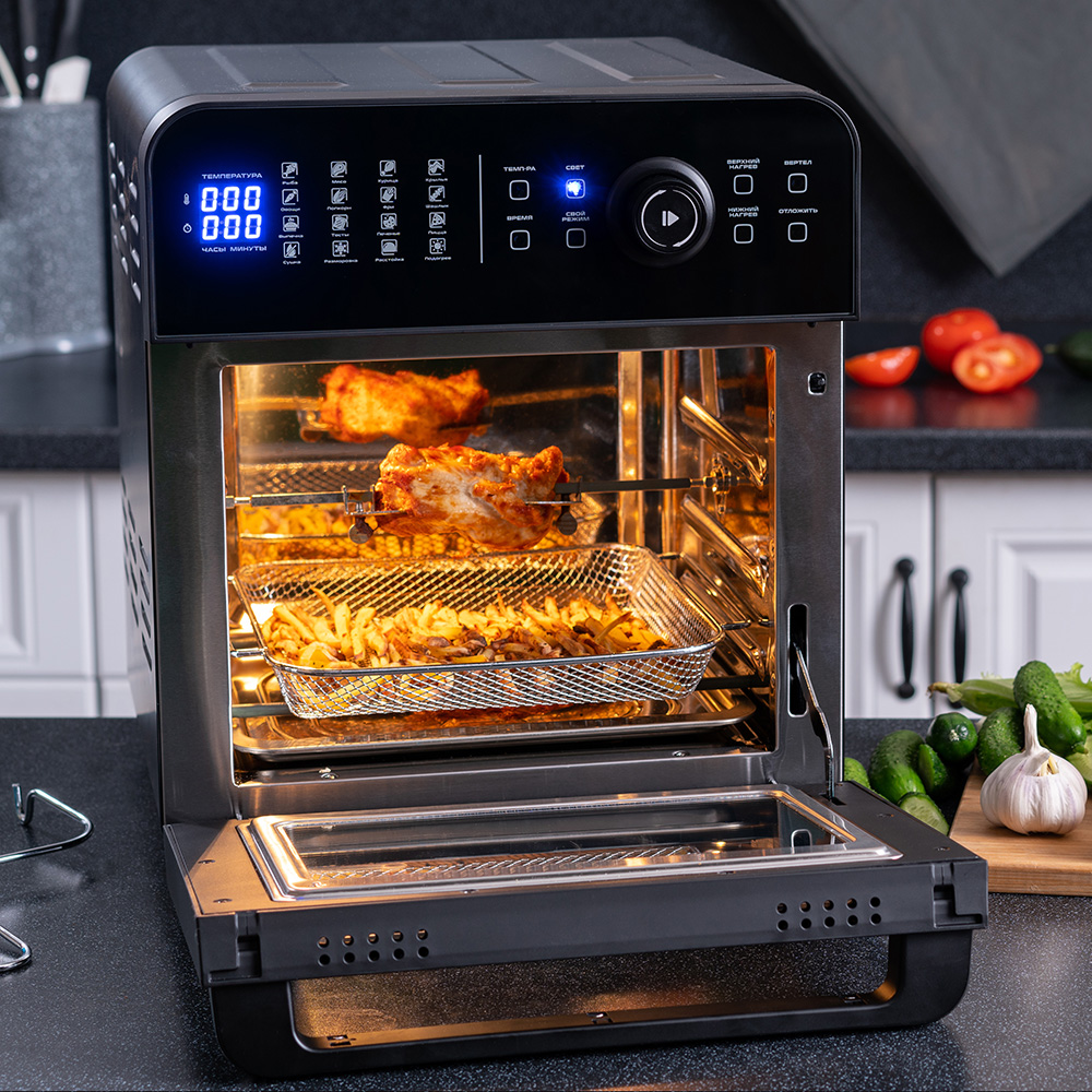 Если в обычной духовке вы вынуждены всё переворачивать и подстраиваться под капризную температуру, то здесь работает мощная конвекция в тандеме с вращением — как в профессиональных грилях. Положили продукты, выбрали режим — и можно не беспокоиться: курица сама будет равномерно запекаться на вертеле, картофель — хрустеть, а пирог — подниматься с золотистой корочкой.
