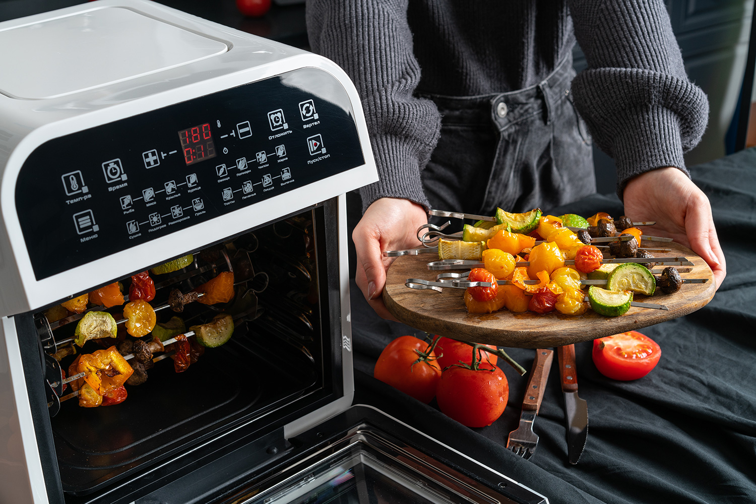 В арсенале — 32 автоматических режима, включая аэрожарку, сушку, выпечку, приготовление на пару, разморозку и даже запекание с вращением. А ещё можно настроить пользовательский режим, вручную выставляя температуру и время.