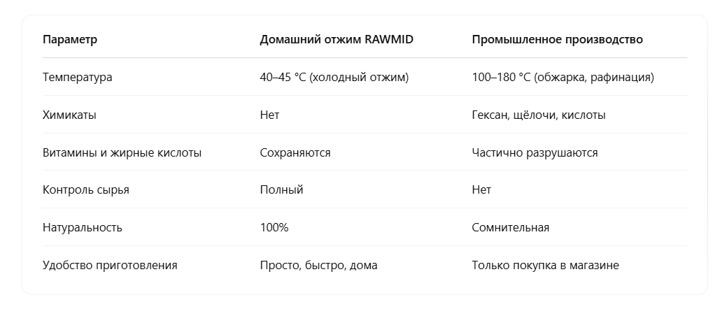 Наш выбор очевиден — мы за домашний отжим. Потому что мы хотим точно знать, что даём своему организму, своей семье и детям. Масло — это не просто добавка к салату. Это источник энергии, гормонов, обновления клеток и иммунитета и RAWMID выбирает чистоту!