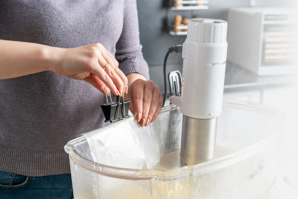 Готовка: Поместите пакет в воду и выберите температурные режимы су-вид для вашего блюда
