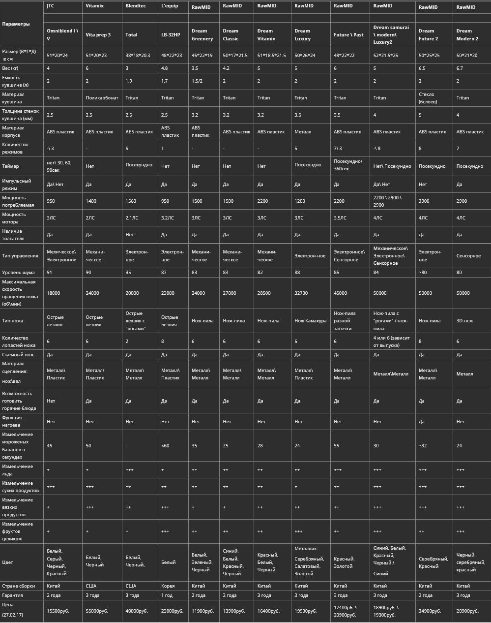 Сравнительная таблица характеристик поможет покупателю подобрать оптимальный блендер. В ней собраны модели-мировые лидеры и фирменные приборы Dream от RAWMID. Таблица призвана дать наглядное представление о характеристиках различных блендеров и их возможностях.
