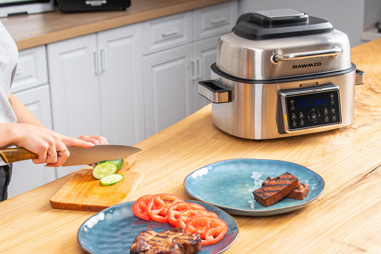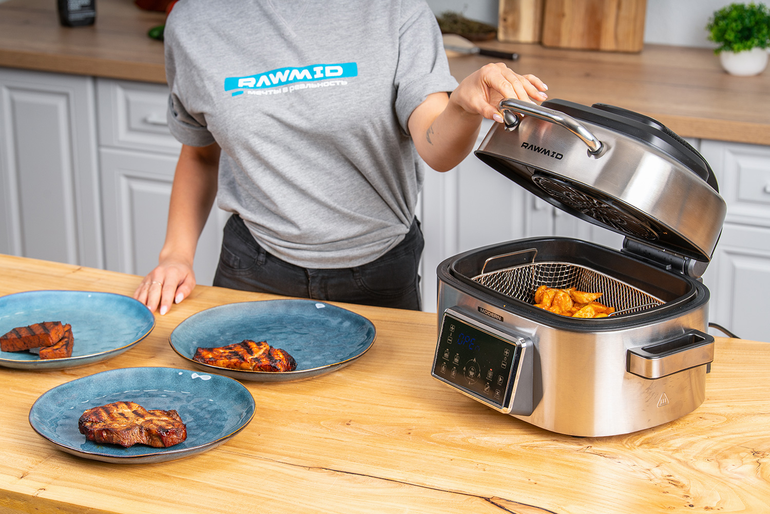 Современные модели, такие как RAWMID Modern RMA-04, создают эффект жарки без сковороды: мясо остаётся сочным внутри и обретает аппетитную корочку снаружи — всё благодаря мощному 5-витковому нагревателю и многоуровневой системе 3D-обдува. Хруст, вкус и аромат как с гриля — но без лишнего жира и усилий.