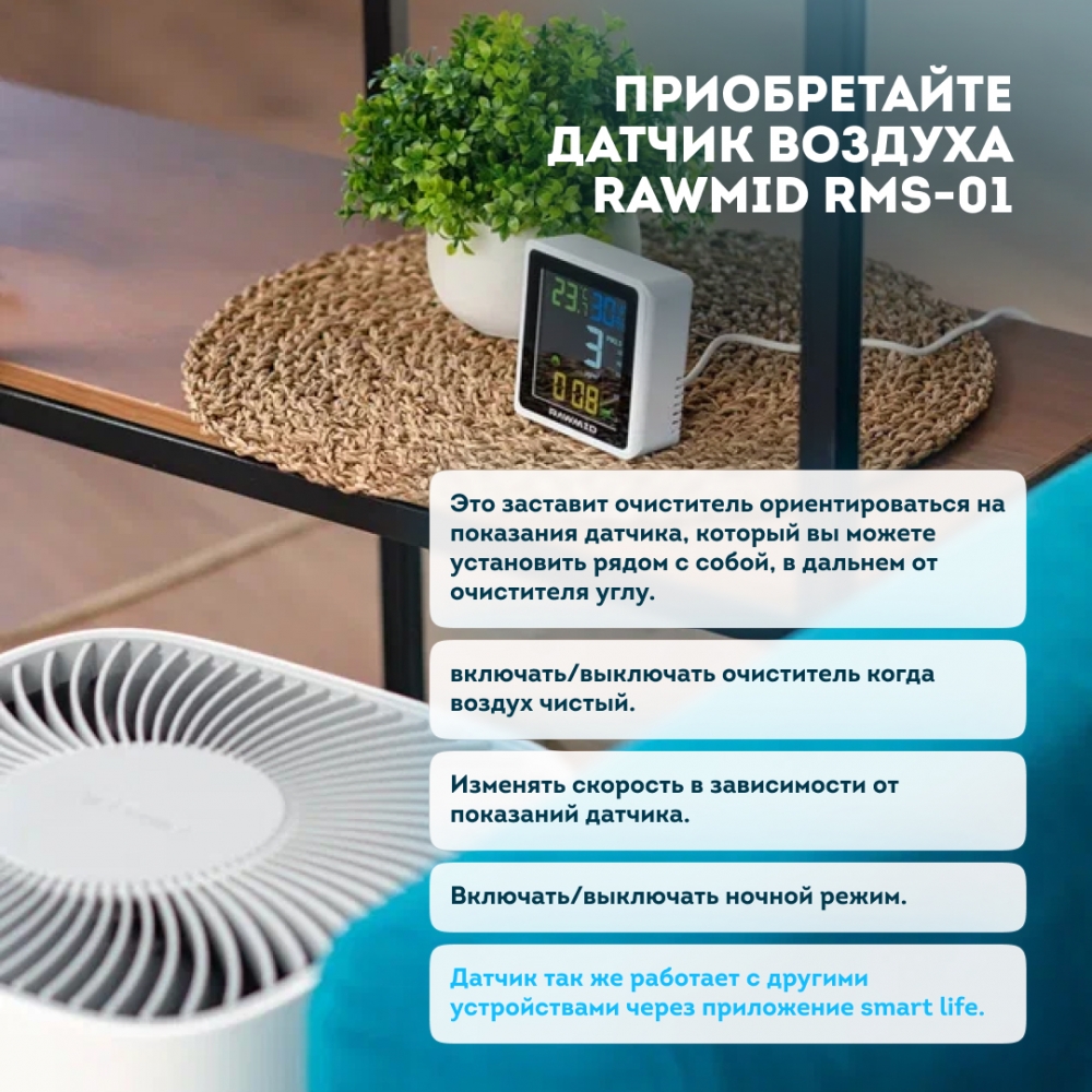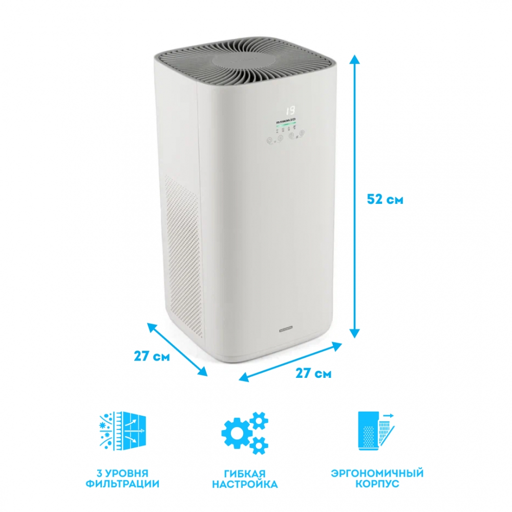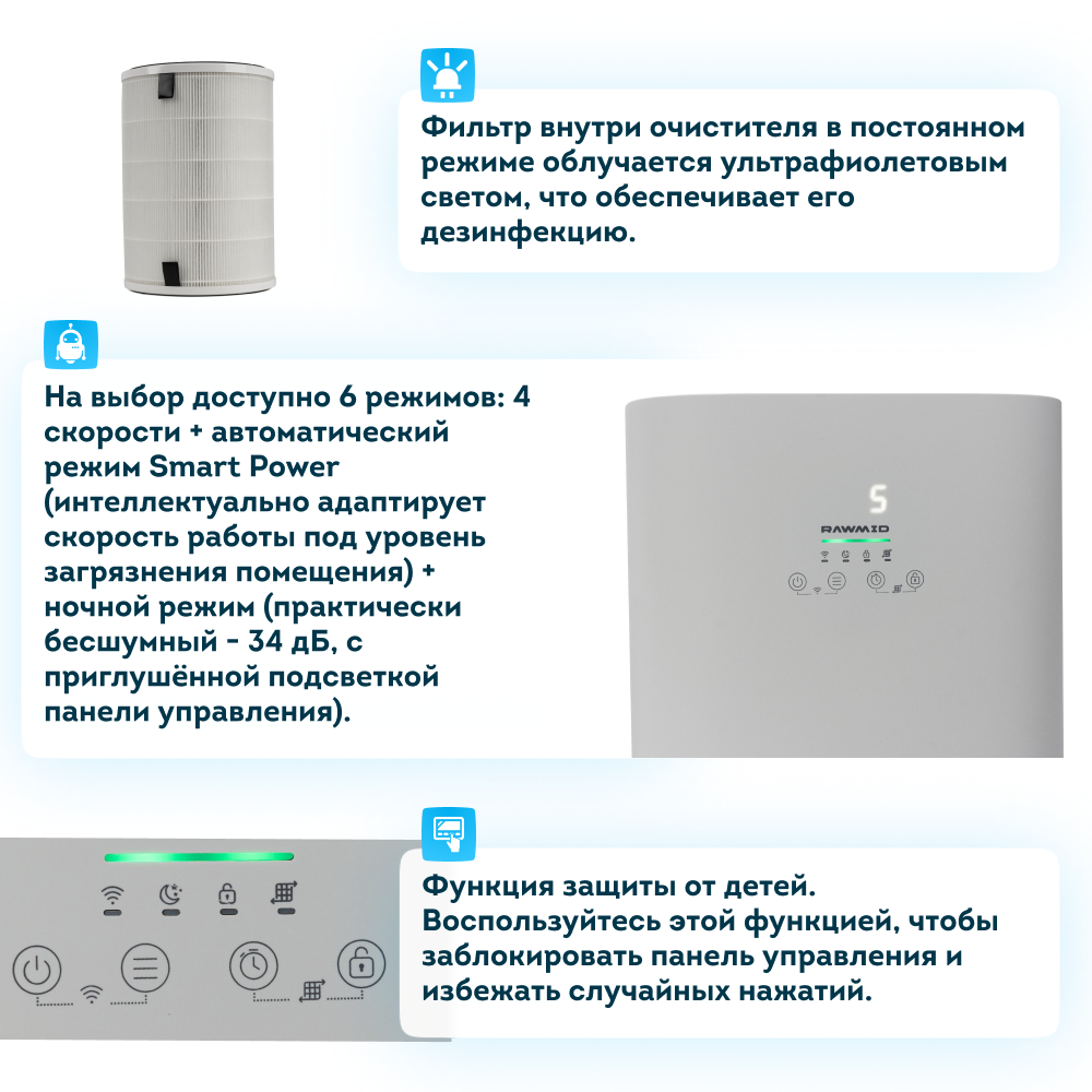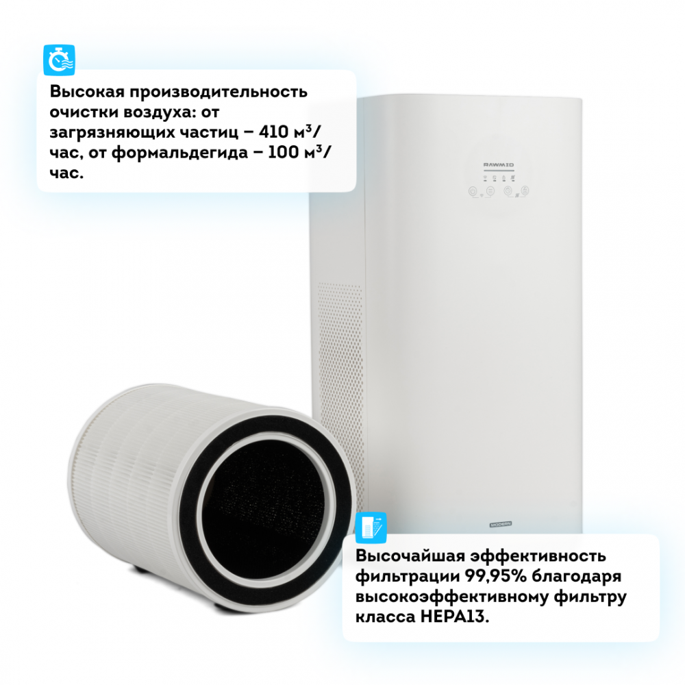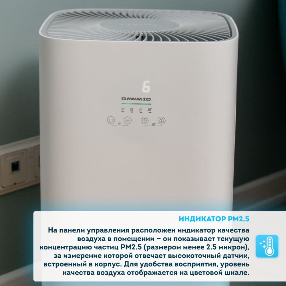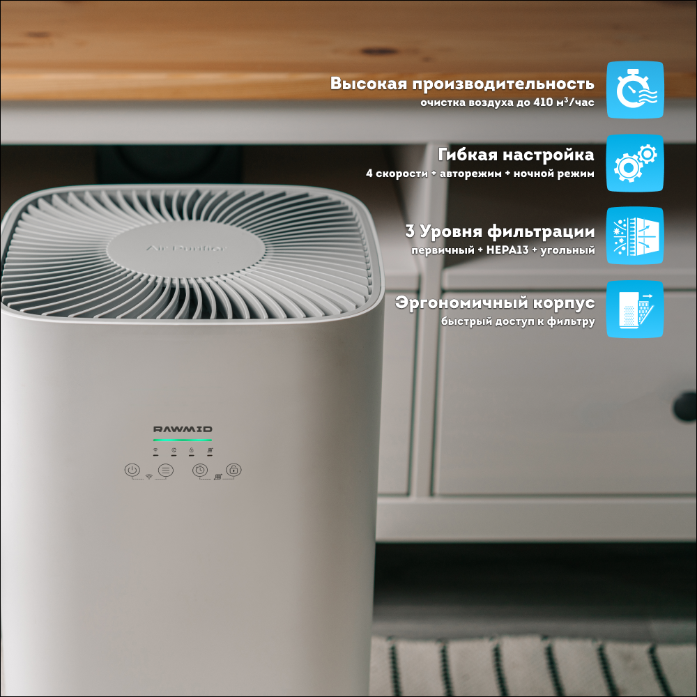 В очистителе воздуха RAWMID Modern RMP-01 установлен высокоэффективный фильтр класса HEPA13. Он удерживает 99,95% аллергенов и самых мельчайших частиц пыли размером менее 0,6 микрона.