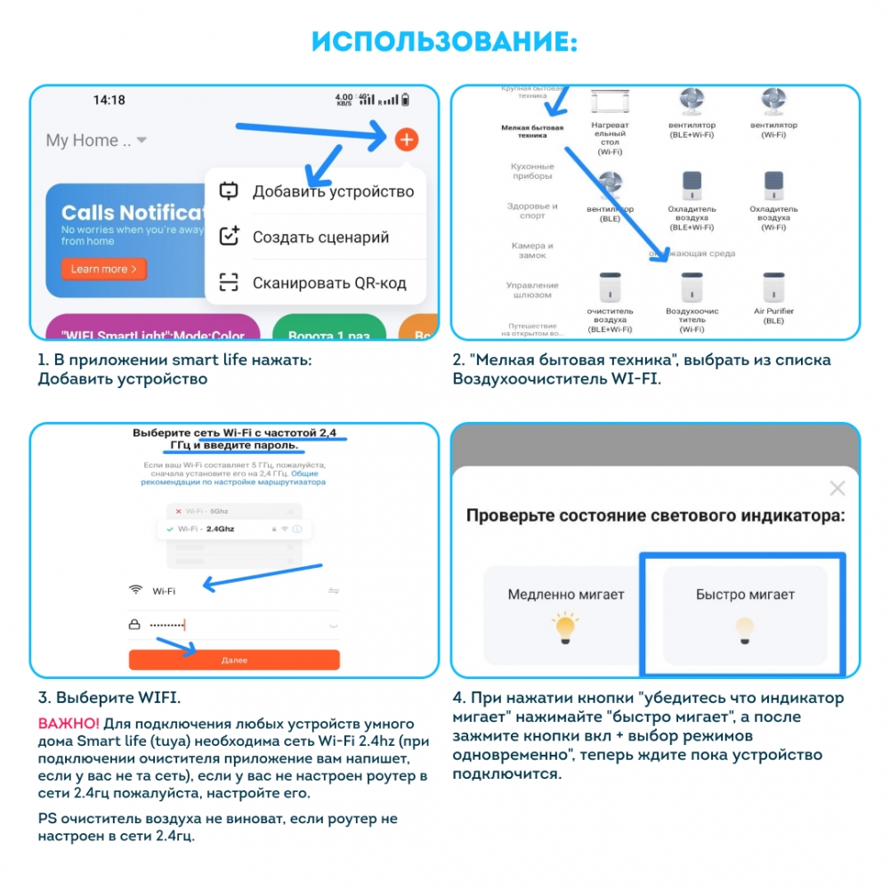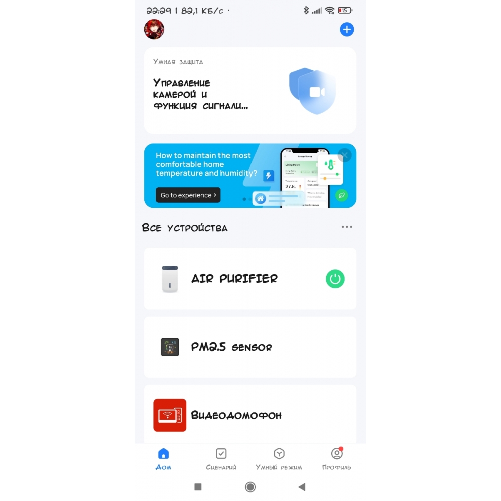 Очиститель можно подключить в приложении Smart Life, после чего вы сможете отслеживать состояние воздуха и управлять прибором со смартфона. Также в приложении можно создать различные сценарии работы очистителя, например, автоматическое включение и отключение ночного режима, включение и отключение по расписанию, привязка к другим устройствам, например, к внешнему датчику частиц PM2.5.