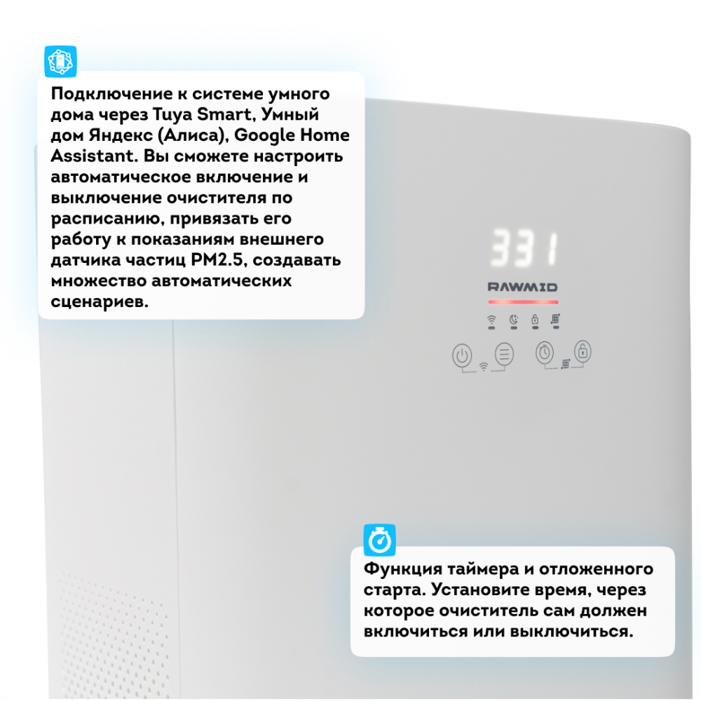 На панели управления можно установить таймер отключения или настроить время для отложенного старта очистителя. Также эти функции можно использовать в мобильном приложении.