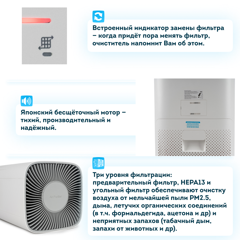 За работу вентилятора отвечает японский бесщёточный мотор. Он тихий, надёжный и долговечный. Во время работы очиститель не будет мешать вам концентрироваться на ваших делах.