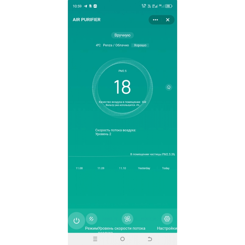 При желании вы можете включить авторежим, чтобы не переключать скорости вручную. В нём очиститель автоматически изменяет скорость работы в зависимости от степени загрязнённости воздуха в помещении.