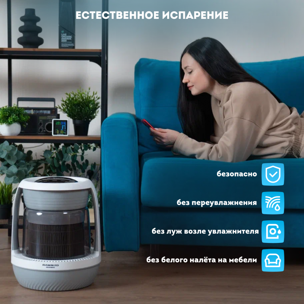Совет: если прибор будет стоять вдали от вас, поставьте датчик воздуха RAWMID RMS-01 рядом с вами и подключите его к увлажнителю через приложение. Так увлажнитель будет поддерживать нужную влажность именно там, где вы находитесь.