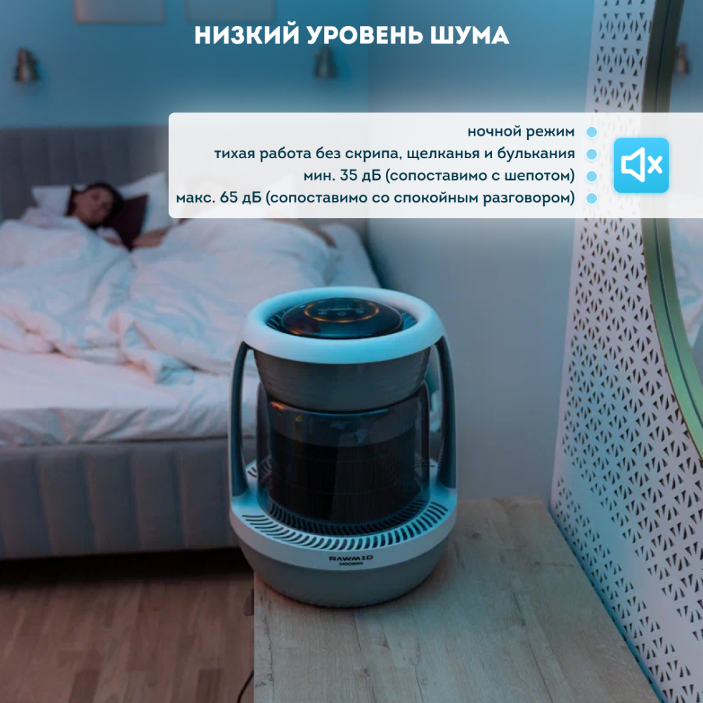 Конструкция увлажнителя RAWMID Modern не содержит в себе шумных подвижных элементов, которые могут скрипеть, щёлкать или булькать. В нём шумит только вентилятор, и даже в самом мощном режиме шум прибора сравним с шумом дегидратора, не превышая 65 дБ. А в ночном режиме прибор практически бесшумен, издавая не выше 35 дБ.
