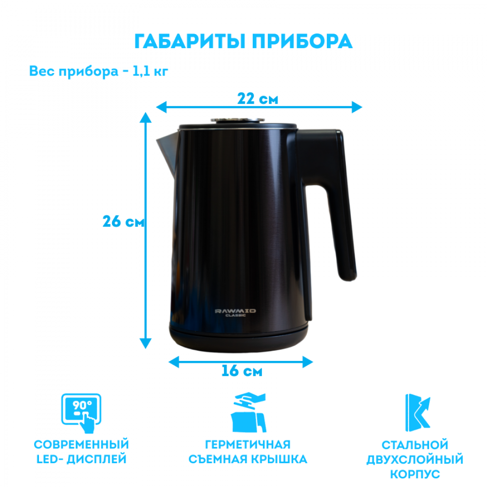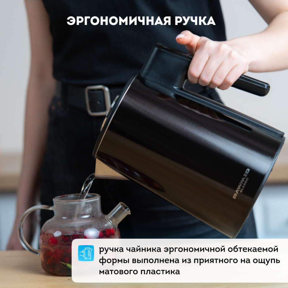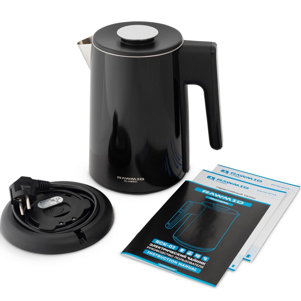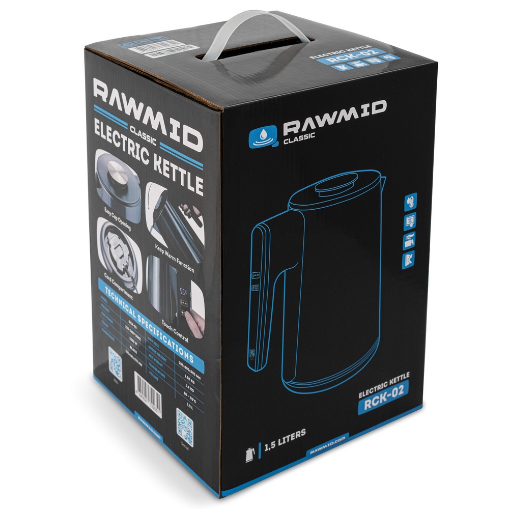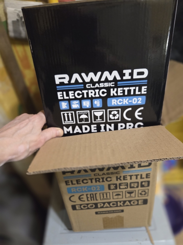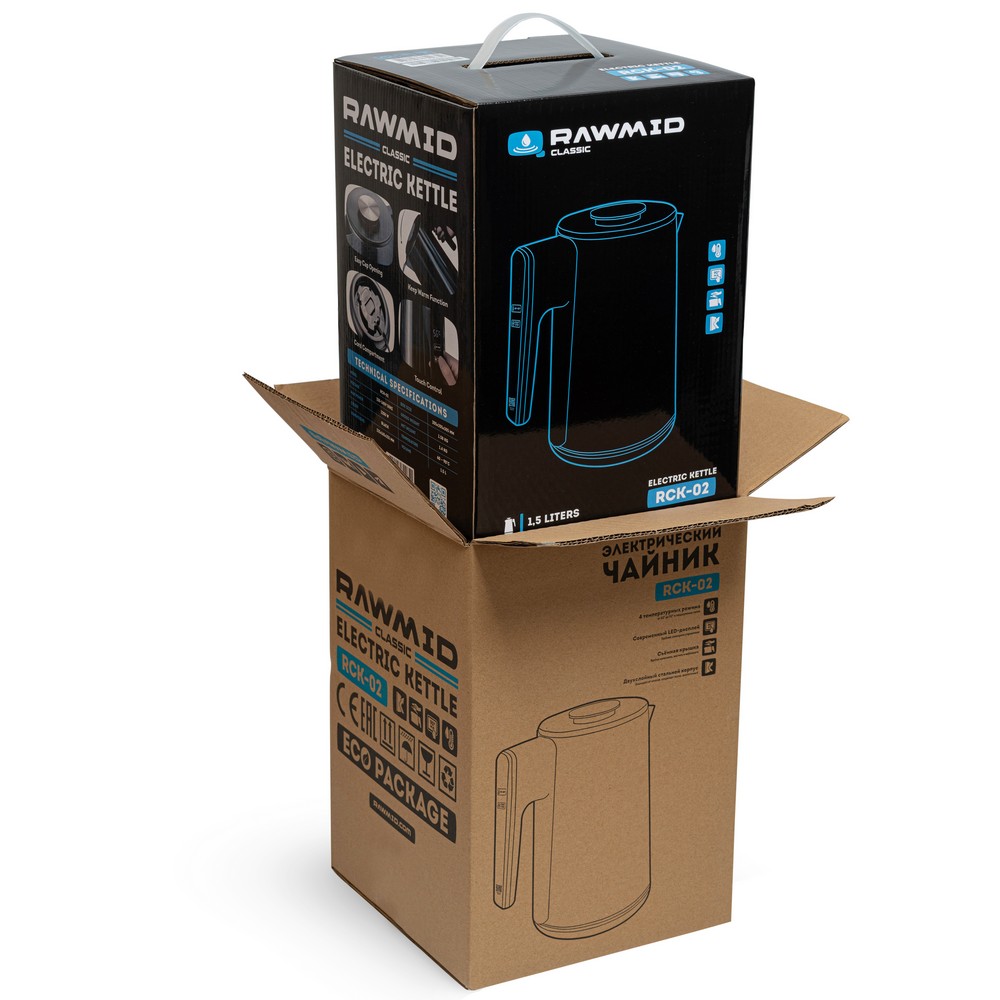 Чайник RAWMID упакован в двойную коробку. Внутренняя — подарочная, с красивым фирменным дизайном. Внешняя — обеспечивает дополнительную защиту во время перевозки.