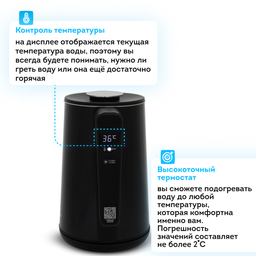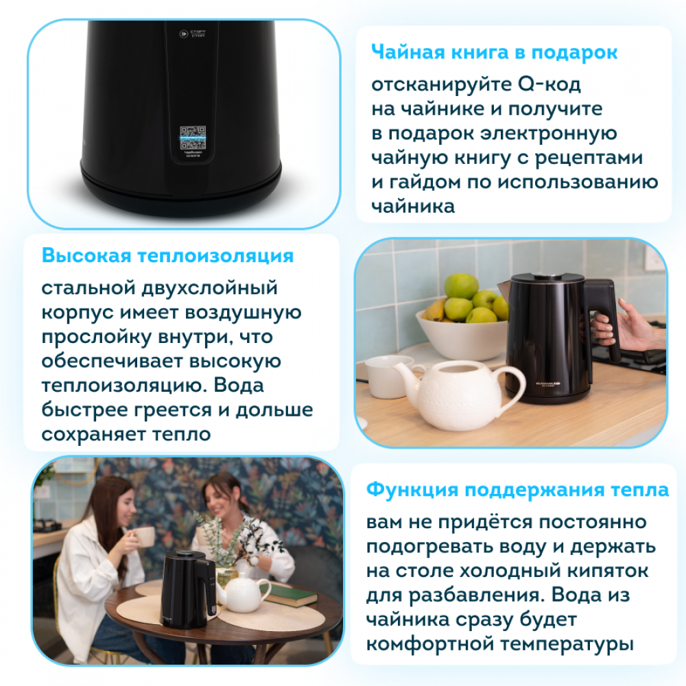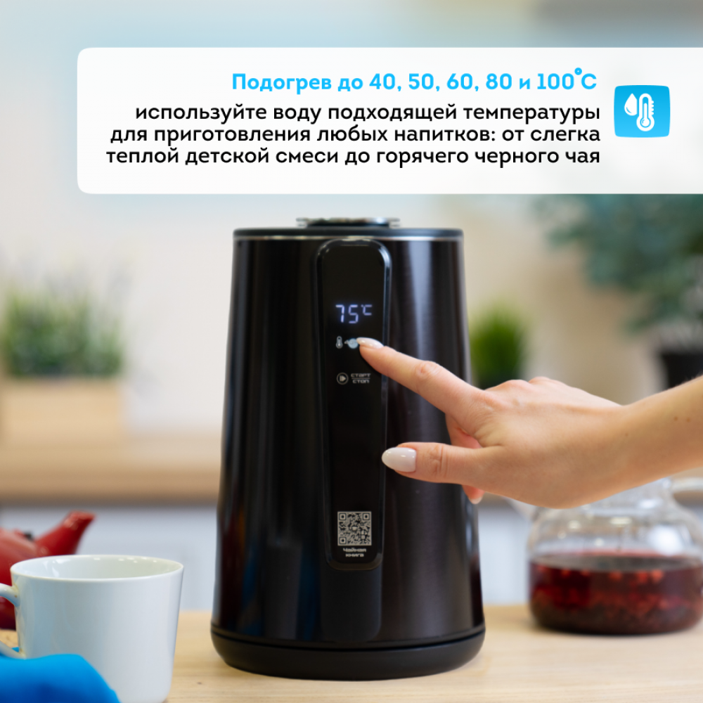 Отсканируйте QR-код на чайнике и получите в подарок электронную чайную книгу с рецептами и гайдом по использованию чайника.