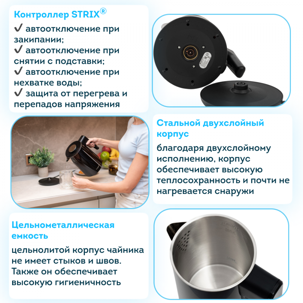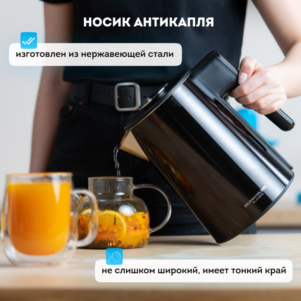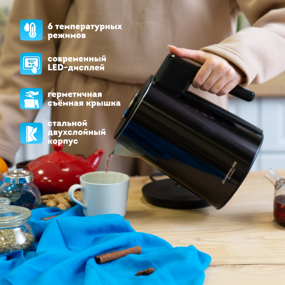 Благодаря двухслойному стальному корпусу и плотной крышке, чайник имеет низкий уровень шума во время работы и не будет мешать вам вести разговоры на кухне.