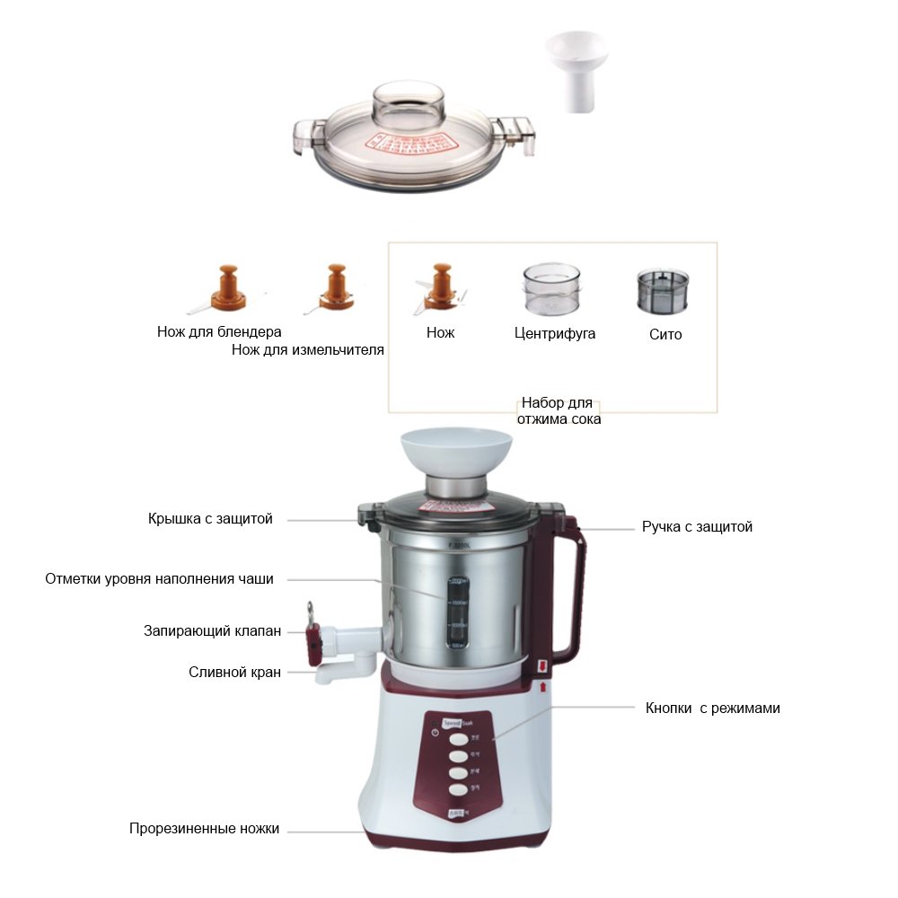 Чаша имеет крышку прозрачную крышку с двойной фиксацией, а также 4 мерных отметки: 500, 1000, 1500 и 2000 мл. Интересная особенность – это наличие крана, который будет удобно использовать для коктейлей и свежевыжатых соков; покупатель также обратит внимание на широкую емкость для подачи продуктов.