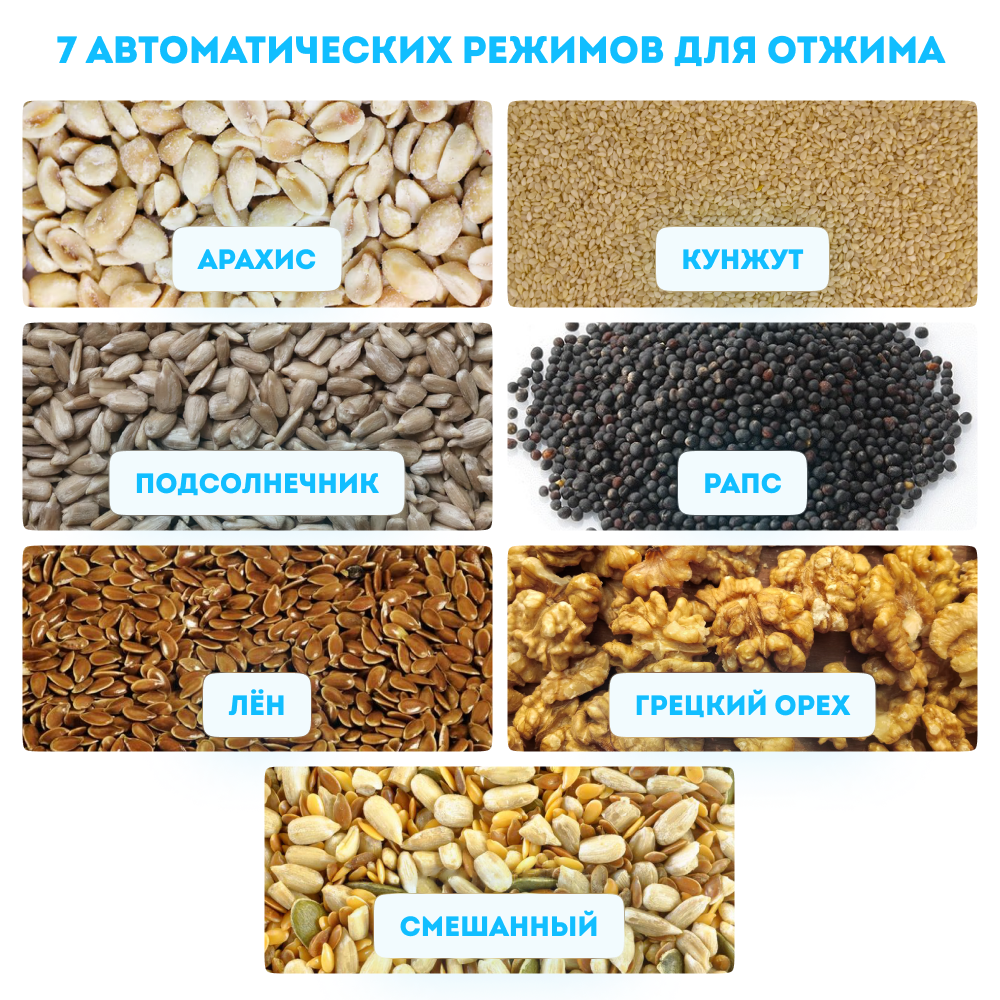 — 7 автоматических режимов для разных типов сырья, в том числе универсальный режим Mixed. После запуска одного из режимов прибор сам прогревается, а затем отжимает масло на оптимальной (минимально подходящей для данного типа сырья) температуре и оборотах шнека;