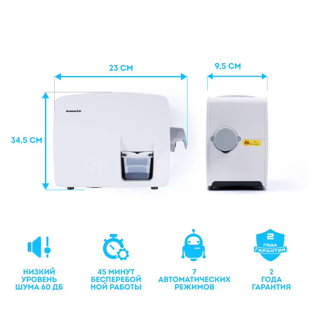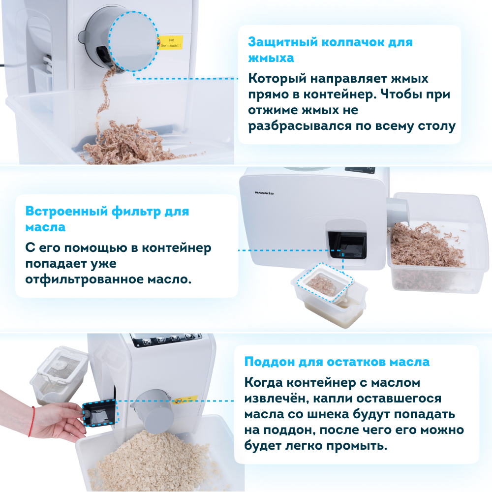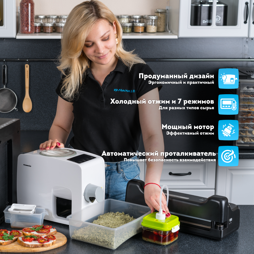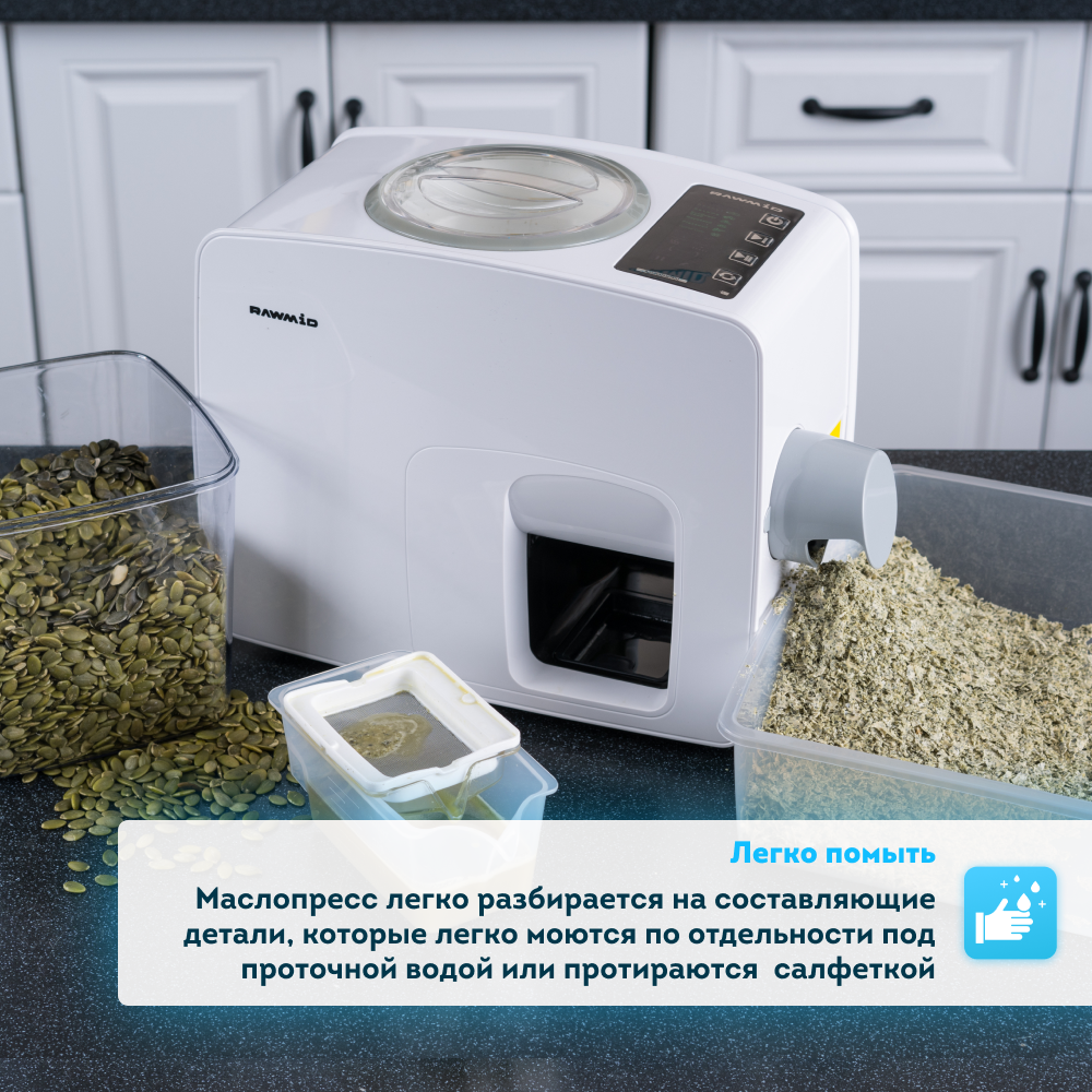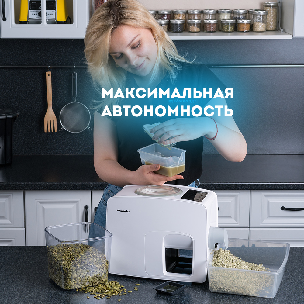 Перед Вами самый домашний среди бытовых и самый бытовой среди домашних маслопрессов. Для его использования не требуется никаких специальных знаний и навыков. Вам не нужно прилагать физических усилий, выполнять сложную сборку и настройку, выставлять температуру прогрева и отжима. Всё необходимое уже сделали инженеры и воплотили в модели RAWMID Modern RMO-03. Вам остаётся лишь наслаждаться автоматическим процессом отжима и его свежим, ароматным результатом.