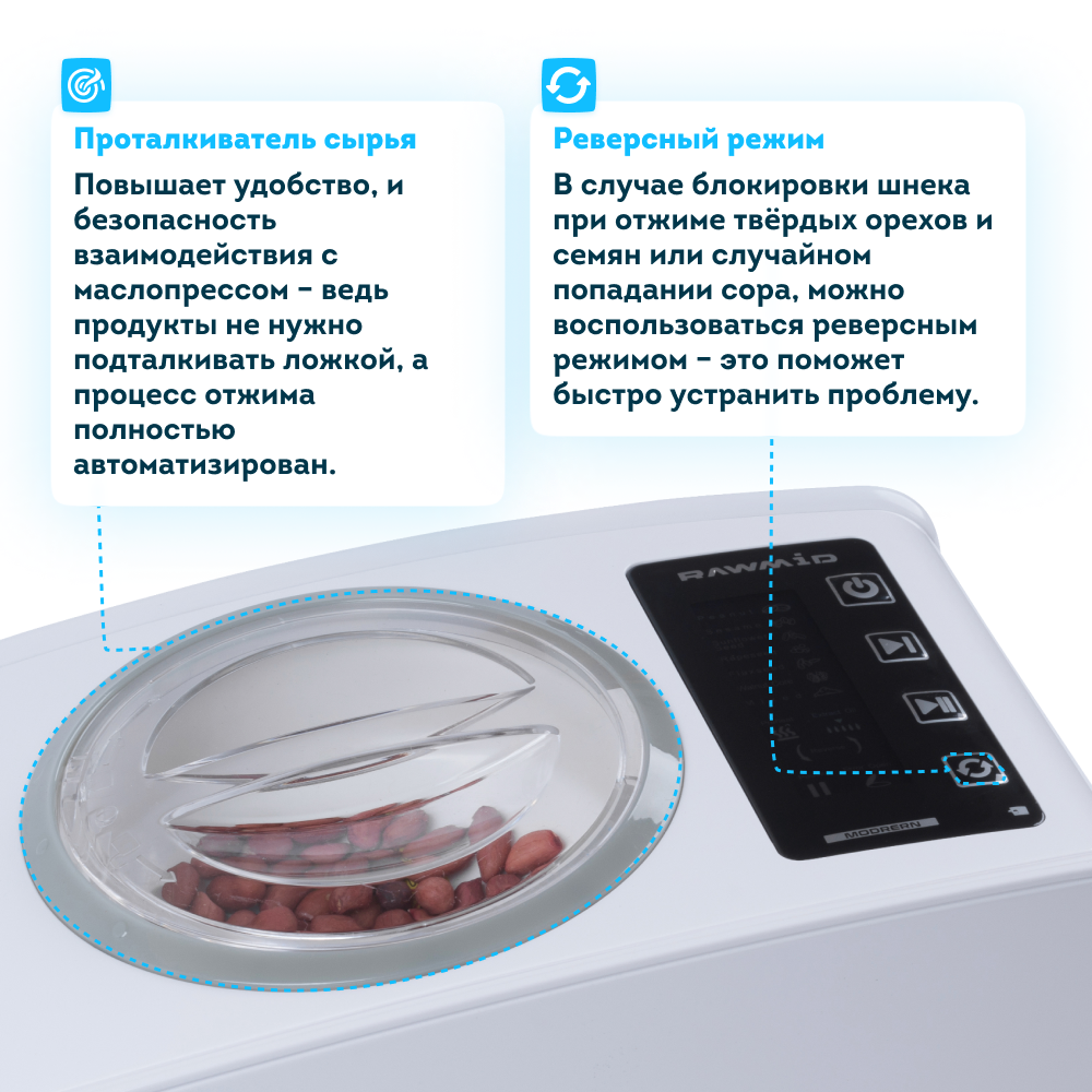 На электронной панели управления всего несколько кнопок: Вкл/Откл, Выбор программы, Старт/Пауза, Реверсный режим. От Вас не требуется выполнять сложные настройки температуры прогрева и отжима – просто выберите нужный режим и нажмите Старт. Маслопресс RAWMID Modern всё сделает сам.