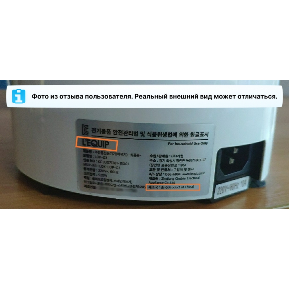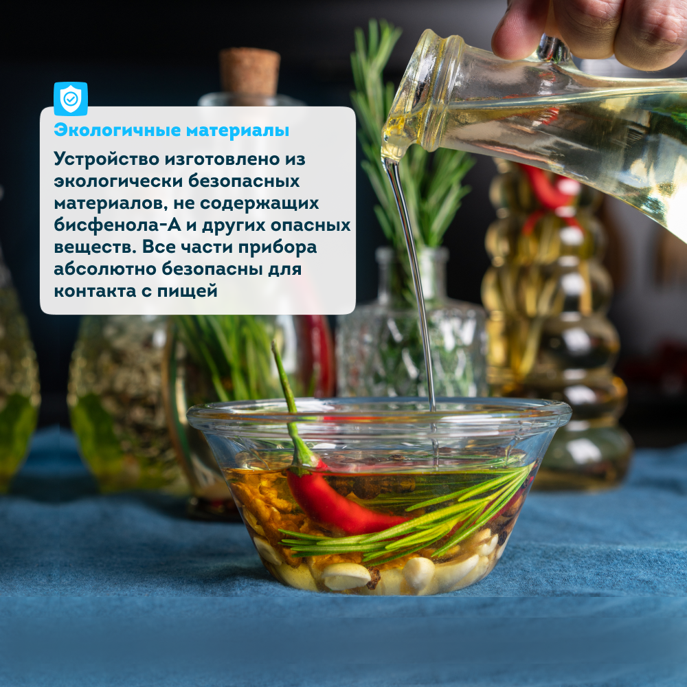 Устройство изготовлено из экологически безопасных материалов, не содержащих бисфенола-А и других опасных веществ. Все части прибора абсолютно безопасны для контакта с пищей.
