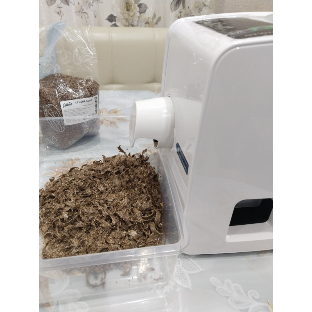 В отсеке, куда засыпается продукт, имеется автоматическая мешалка, которая проталкивает семена и орехи к загрузочному отверстию. Это повышает удобство, и безопасность взаимодействия с маслопрессом – ведь продукты не нужно подталкивать ложкой, а процесс отжима полностью автоматизирован.