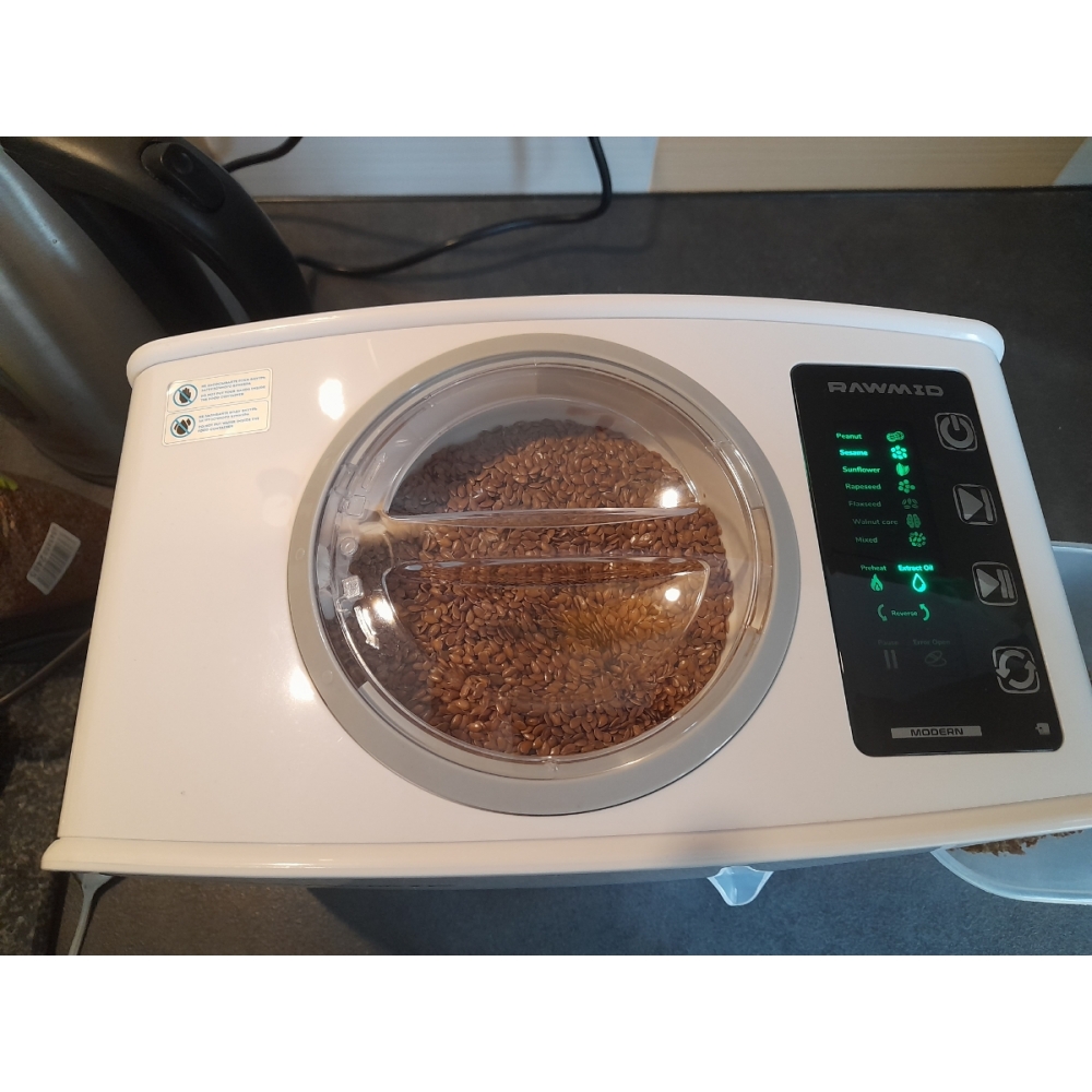 В маслопрессе RAWMID Modern предусмотрено 7 автоматических режимов для отжима масла из различных культур: Арахис (95°С, 56.6 об/мин), Кунжут (70°С, 40 об/мин), Подсолнечник (80°С, 56.6 об/мин), Рапс (80°С, 40 об/мин), Лён (95°С, 40 об/мин), Грецкий орех (80°С, 56.6 об/мин), Смешанный (70°С, 40 об/мин). Просто выберите подходящий режим, а прибор сам прогреется и отожмёт масло на оптимальных температурах и оборотах шнека.