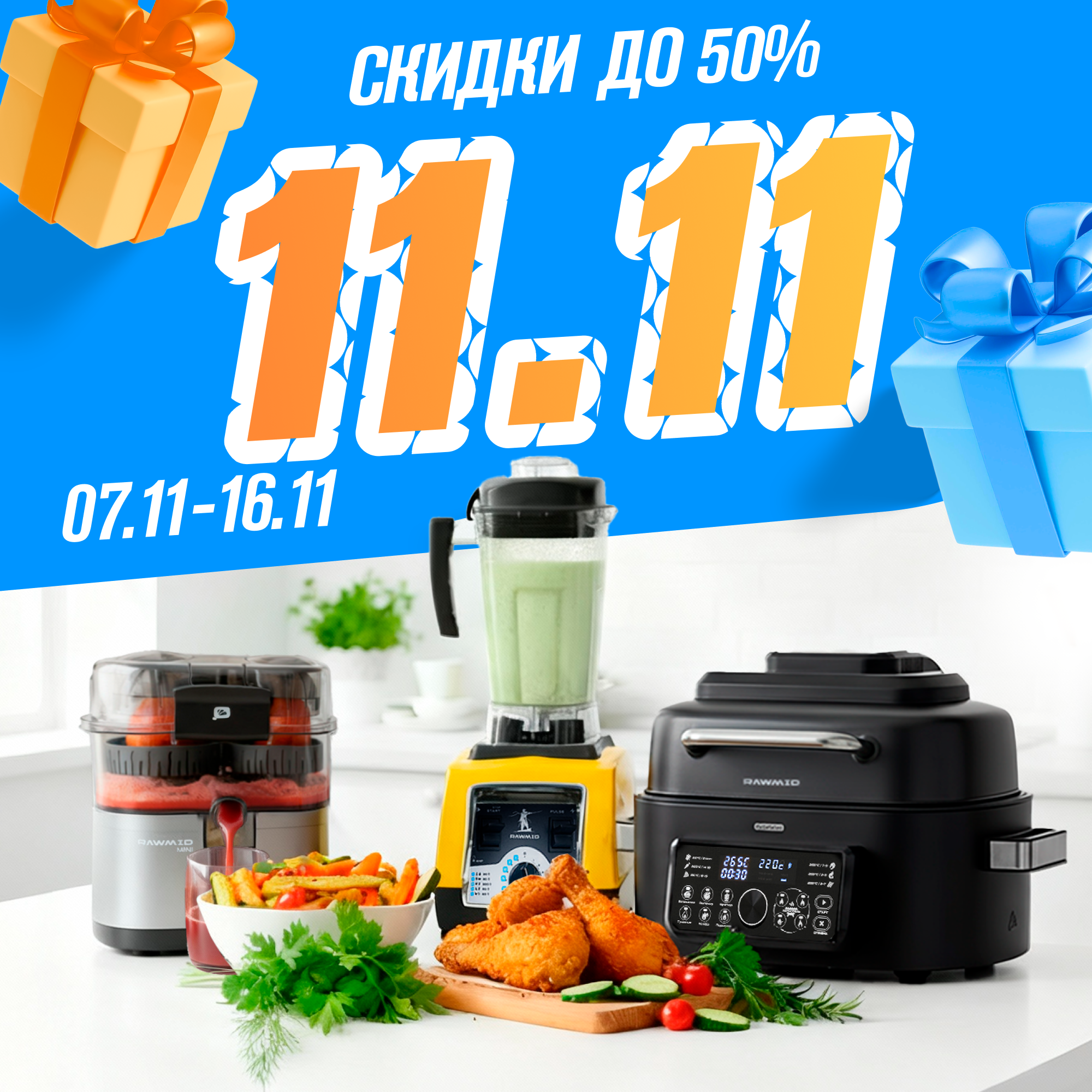 А чтобы обновление кухни стало приятным и выгодным, с 7 по 16 ноября RAWMID проводит распродажу 11.11 — со скидками до 50% на надёжную технику для дома.