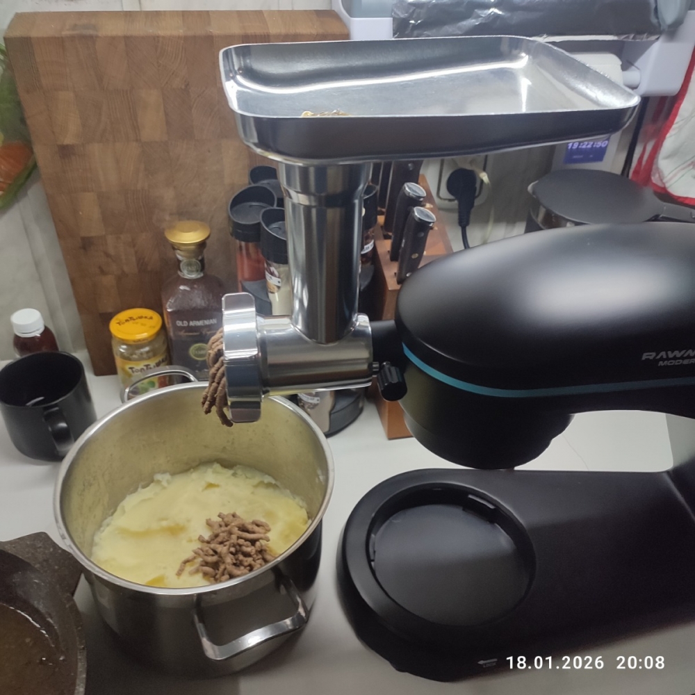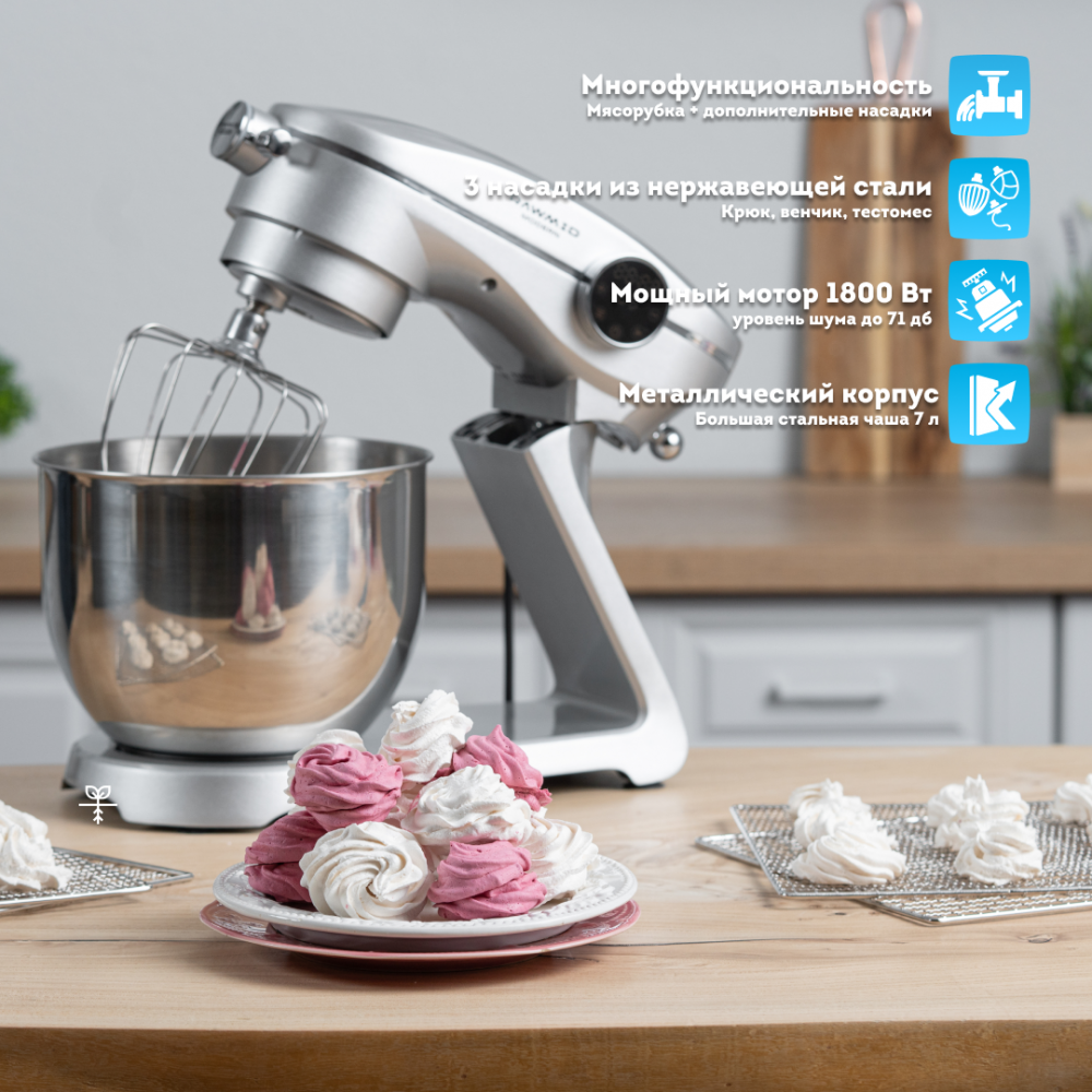 Высокая мощность гарантирует надёжную работу прибора даже при высоких нагрузках, например, при замешивании густого теста или измельчении жёстких продуктов в мясорубке.