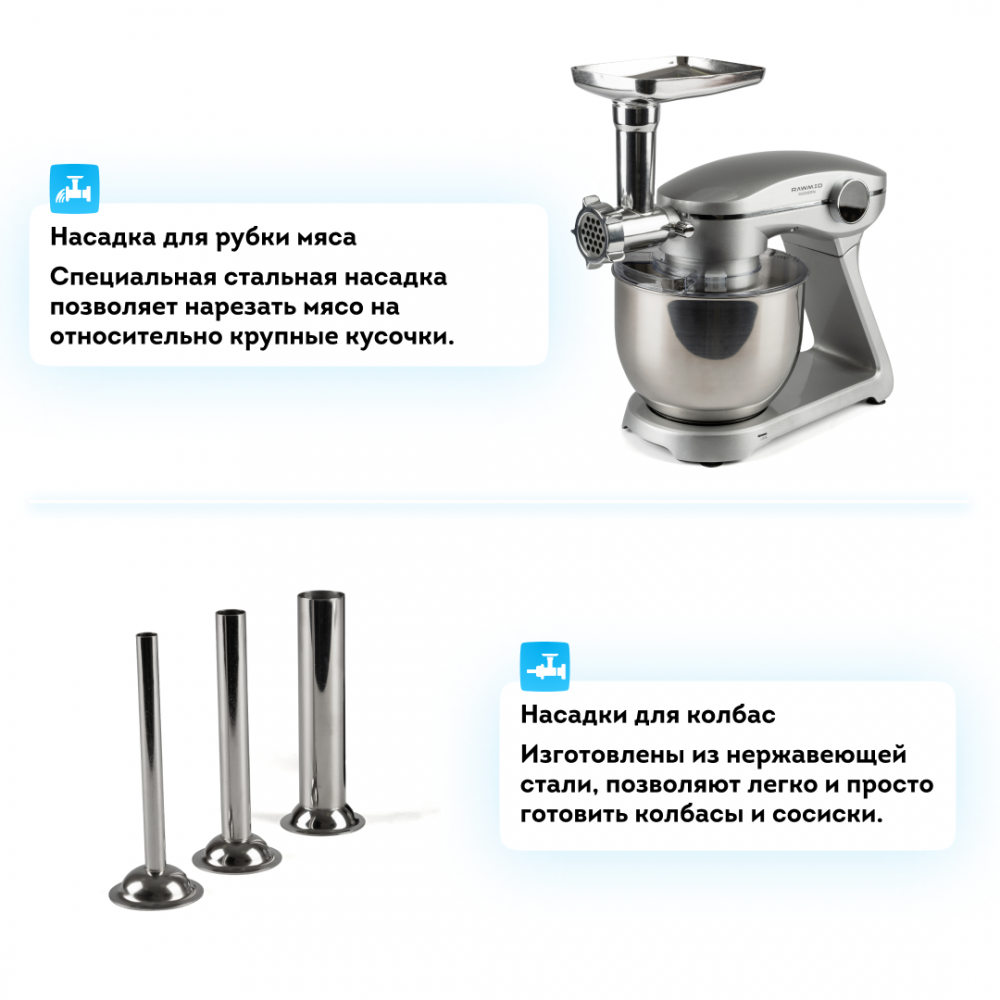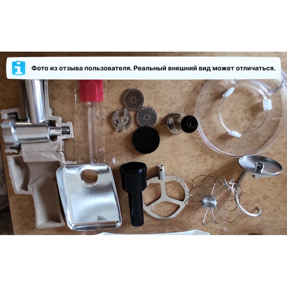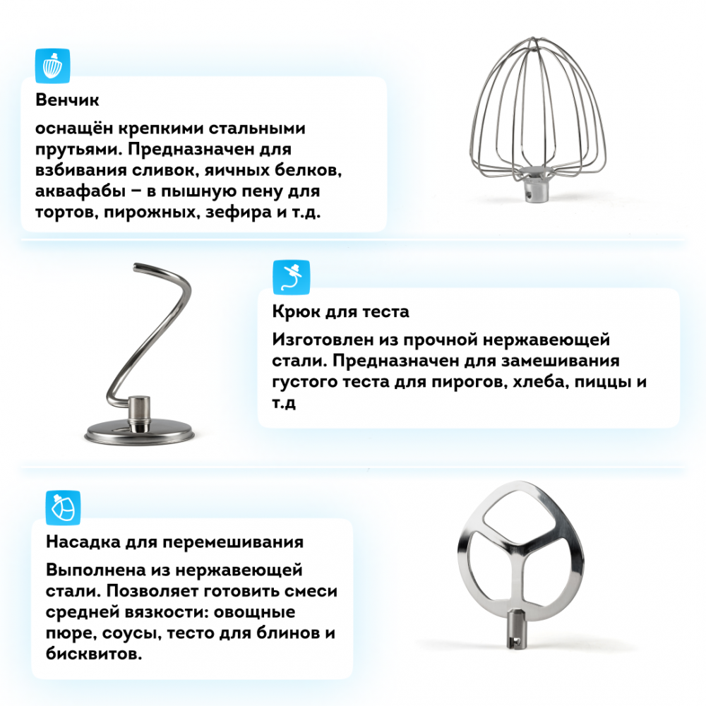 Стальные насадки Основные насадки миксера — венчик (прутья), лопатка и крюк — изготовлены из прочной нержавеющей стали. Их можно мыть в посудомойке (кроме венчика).