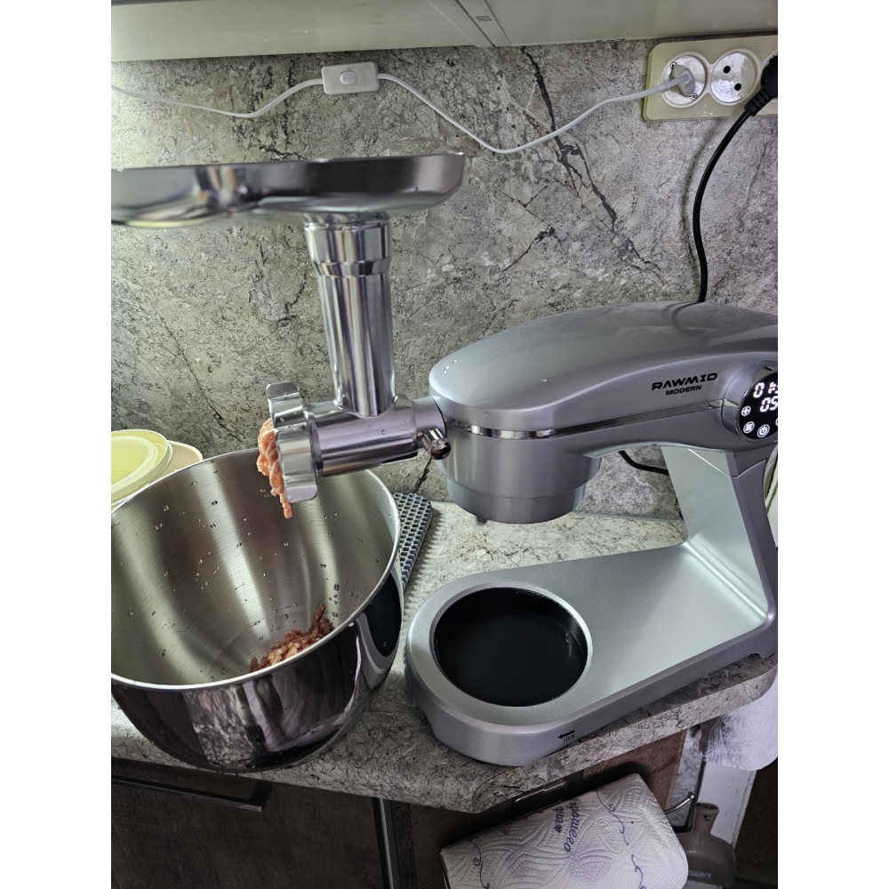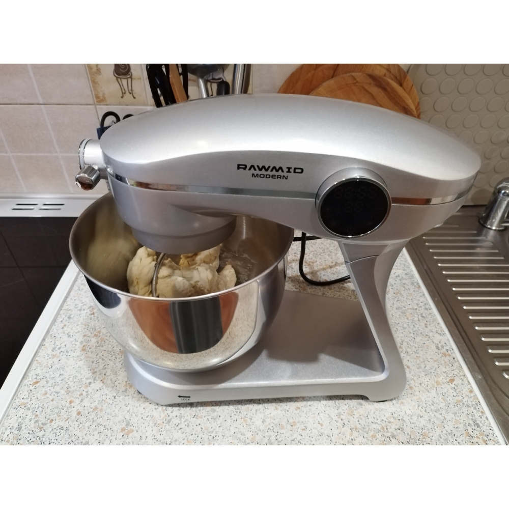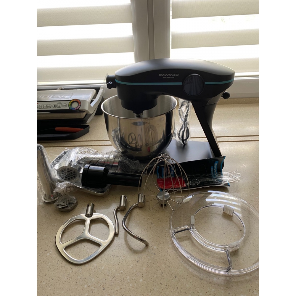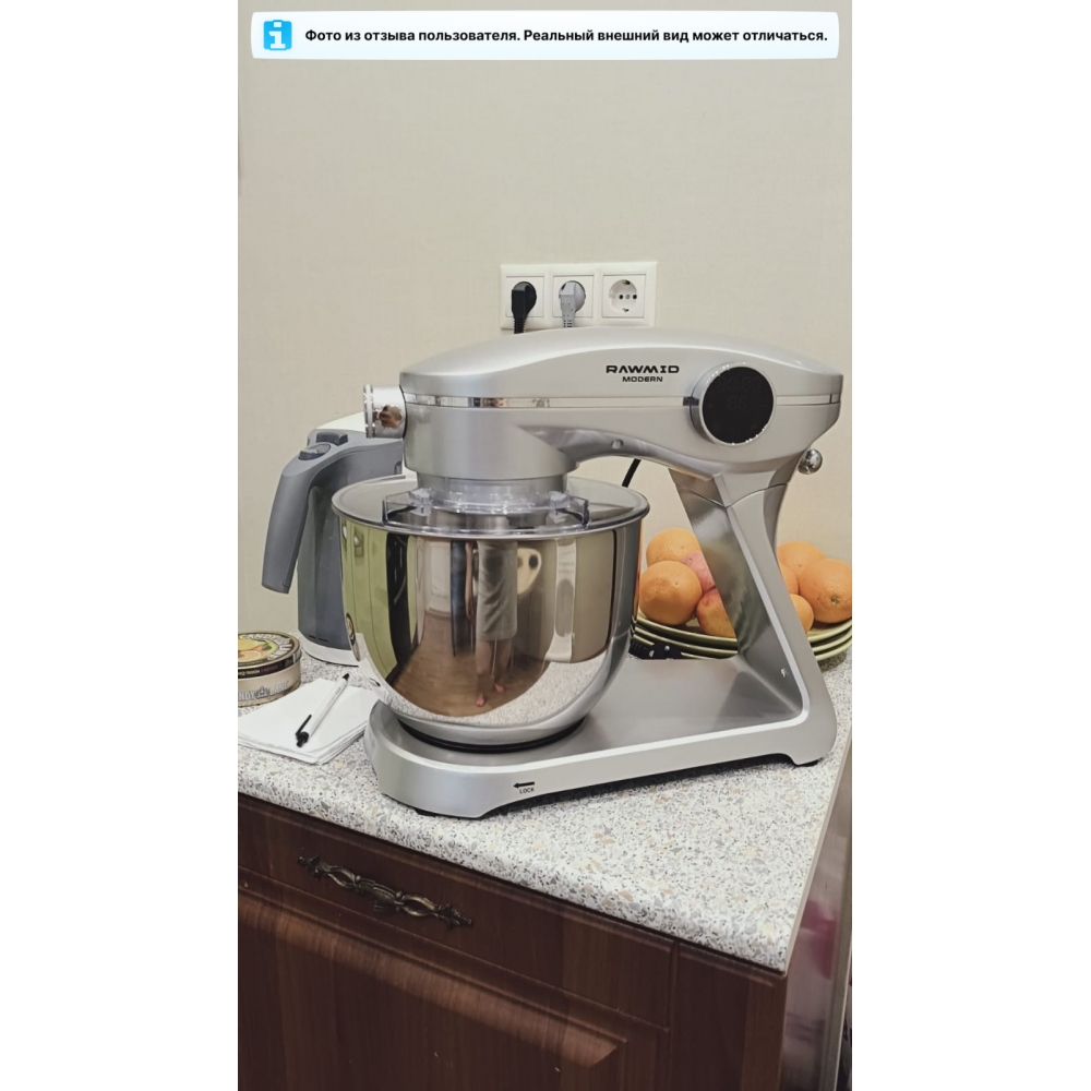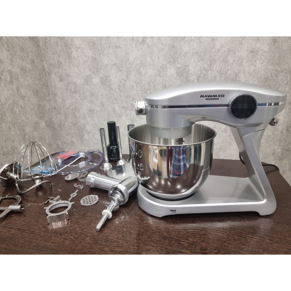 Планетарный миксер RAWMID Modern RMM-02 идеально подходит для замешивания жидкого и густого теста, соусов, кулинарных смесей и кремов. В комплект входят насадки: венчик, крюк для теста, насадка для перемешивания, мясорубка с 3 дисками для фарша, 3 насадки для колбас разного диаметра.