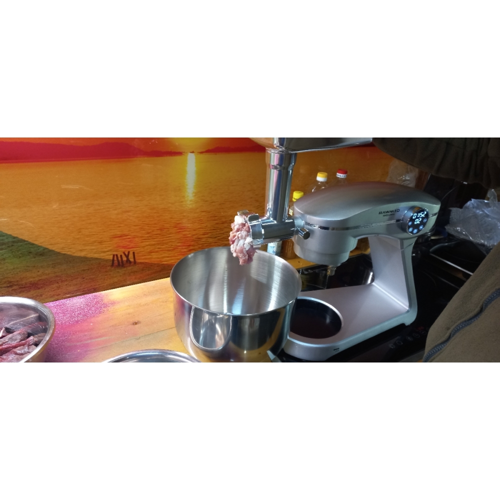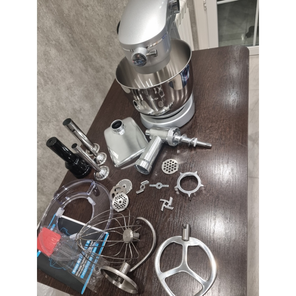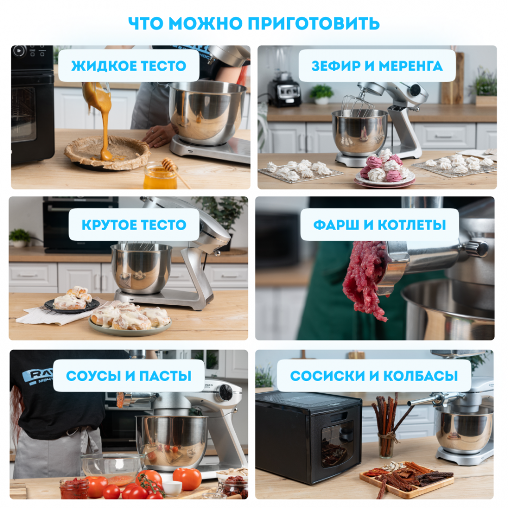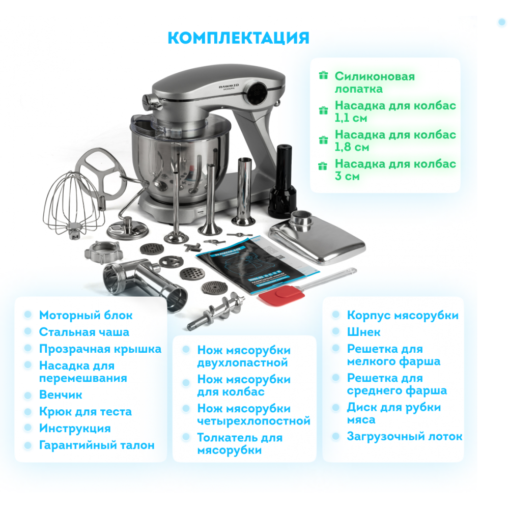 Планетарный миксер RAWMID Modern RMM-02 идеально подходит для замешивания жидкого и густого теста, соусов, кулинарных смесей и кремов. В комплект входят насадки: венчик, крюк для теста, насадка для перемешивания, мясорубка с 3 дисками для фарша, 3 насадки для колбас разного диаметра.