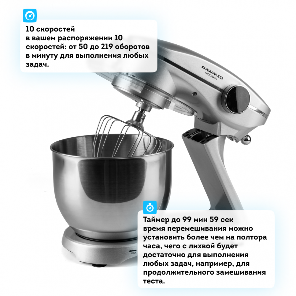 В вашем распоряжении 10 скоростей: от 50 до 219 оборотов в минуту для выполнения любых задач. Благодаря широкому выбору, вы сможете подобрать оптимальную скорость для каждого вашего рецепта.