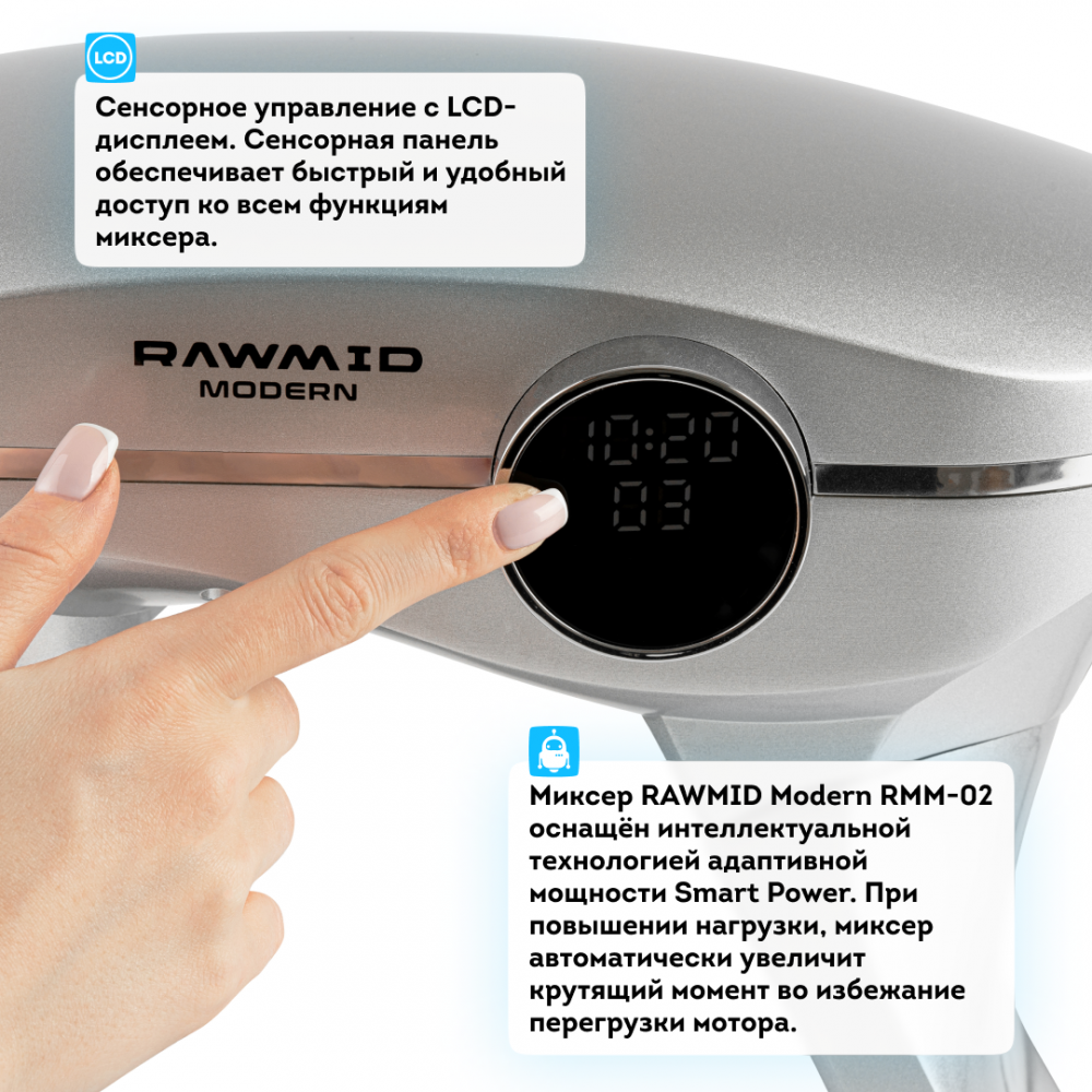 Миксер RAWMID Modern RMM-02 оснащён интеллектуальной технологией адаптивной мощности Smart Power. При повышении нагрузки, миксер автоматически увеличит крутящий момент во избежание перегрузки мотора.