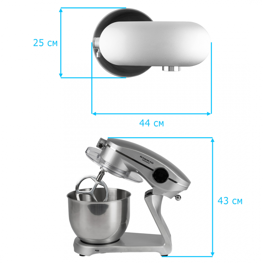 Конструкция планетарного миксера RAWMID позволяет взбить венчиком даже 1 яйцо (либо 2 яичных белка) для приготовления даже самых маленьких порций.