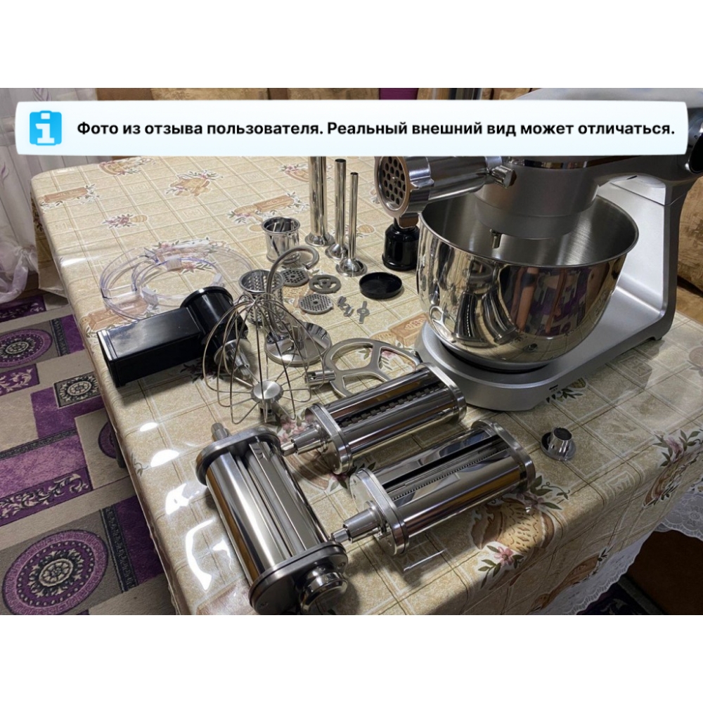 Набор для теста и макарон В комплект входят две стальные насадки. Насадка для раскатки теста позволяет быстро и легко сделать заготовку для лазаньи, пиццы или пирога. Толщина теста регулируется от 1 до 9. Вторая насадка предназначена для приготовления фетучини.
