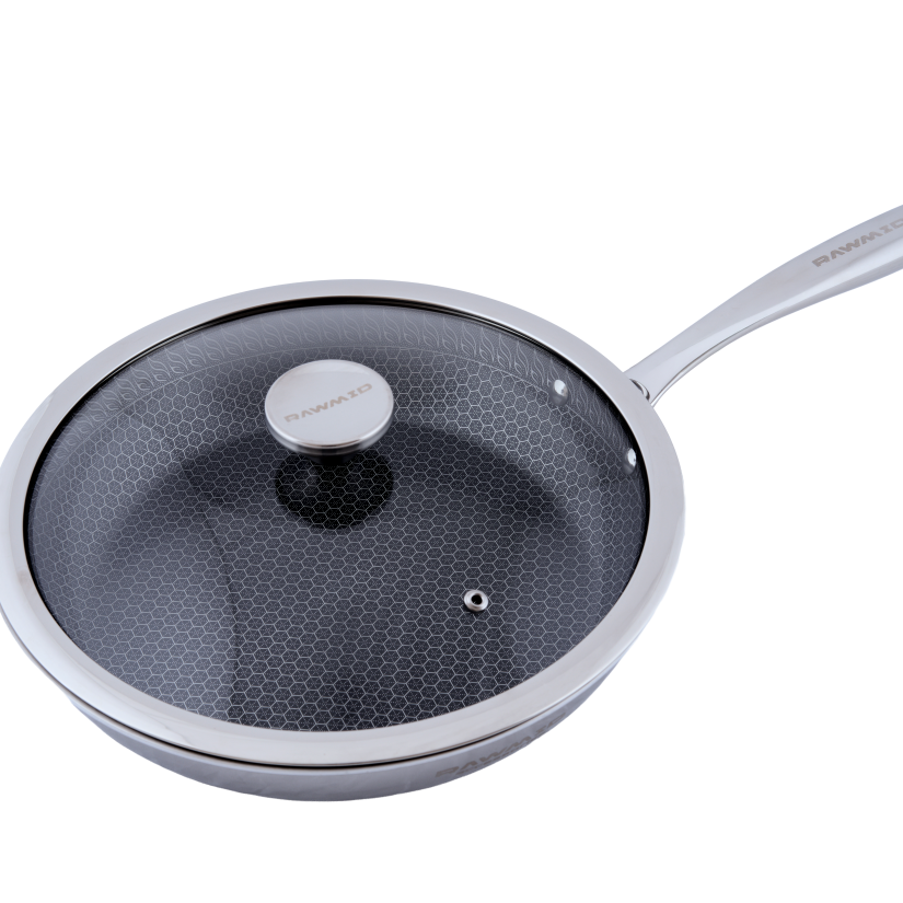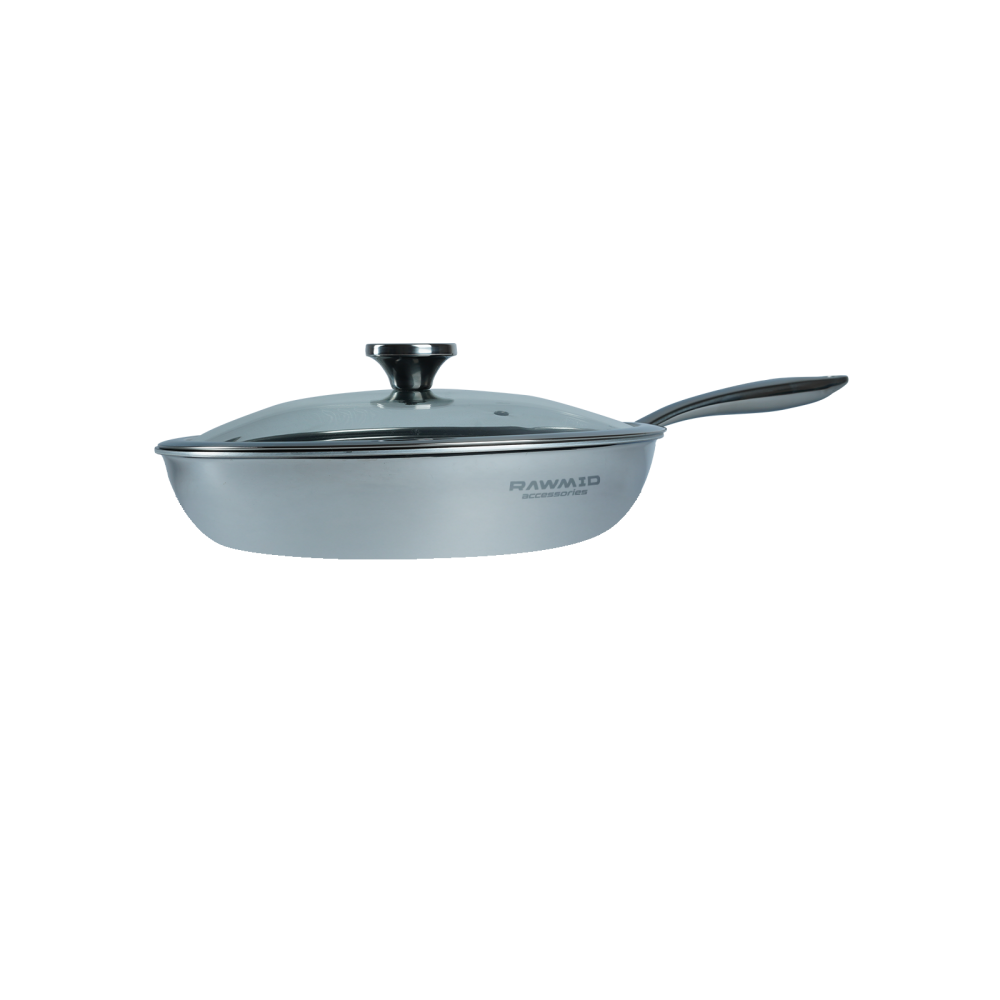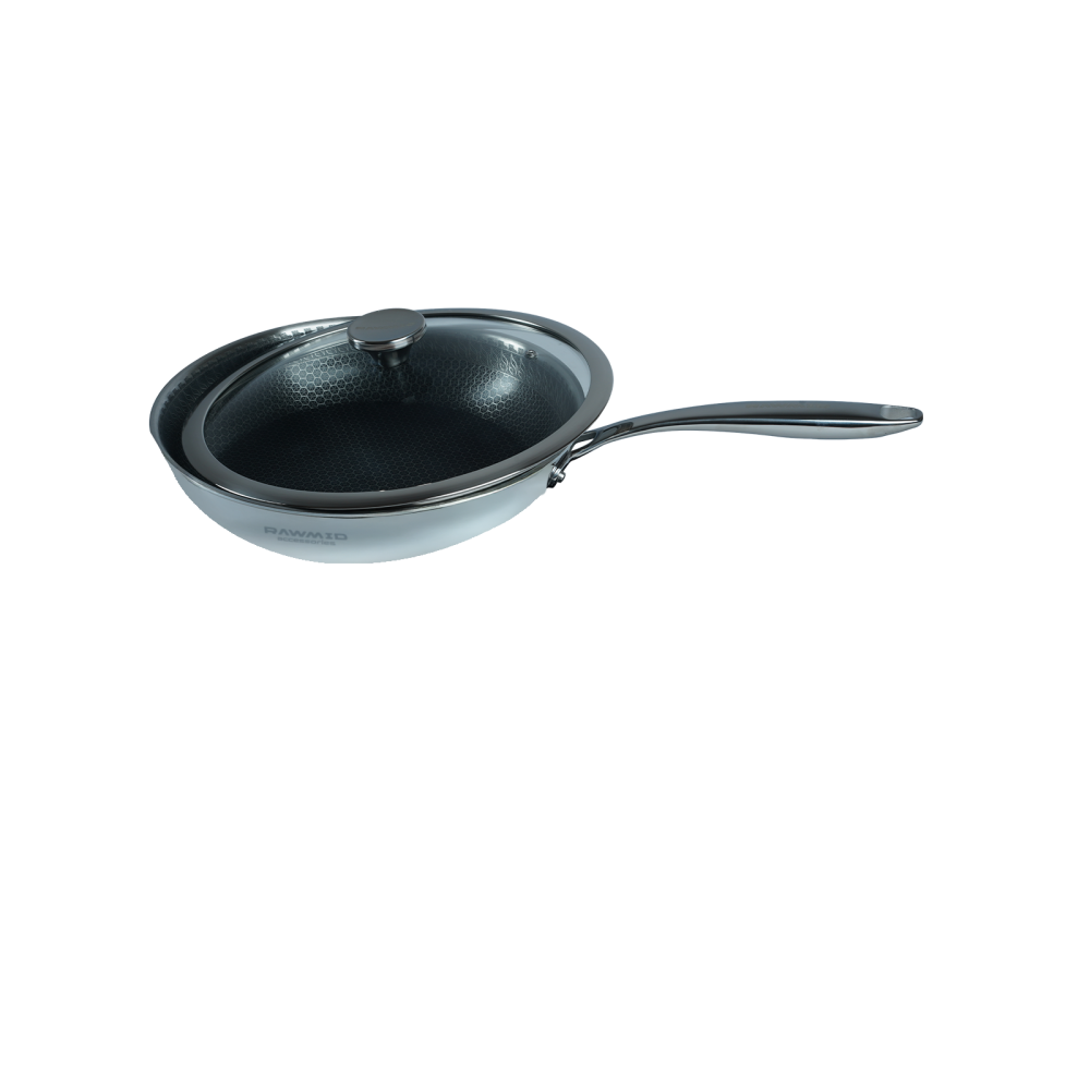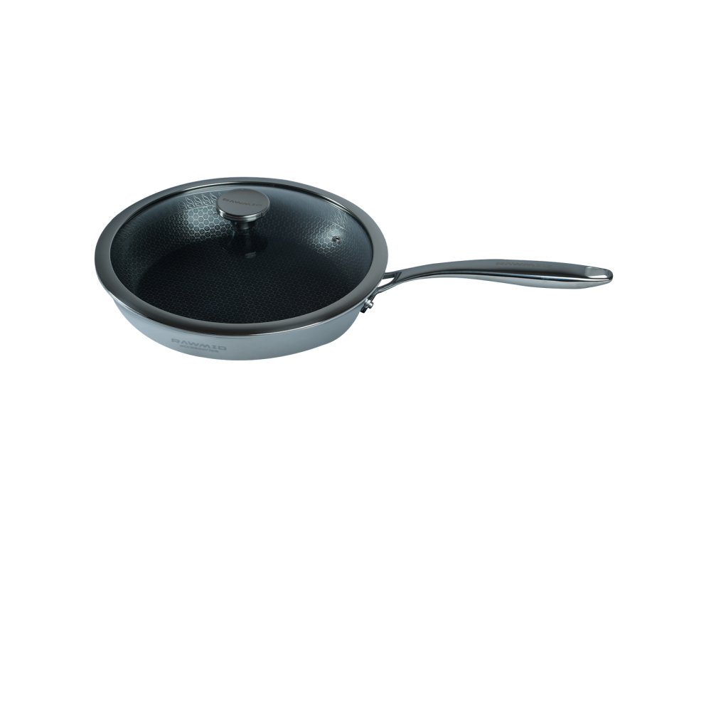 RAWMID RAP-01 — универсальная сковорода с крышкой из трёхслойной стали и керамическим антипригарным покрытием Whitford FUSION. Внутренняя поверхность усилена технологией Honeycomb, которая повышает износостойкость и защищает покрытие от царапин. Трёхслойный корпус с алюминиевым сердечником обеспечивает быстрый и ровный нагрев без горячих точек, что делает сковороду удобной как для жарки, так и для тушения или запекания.