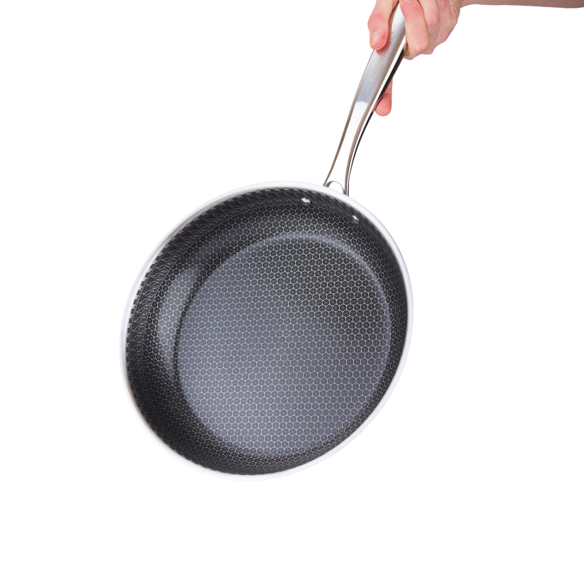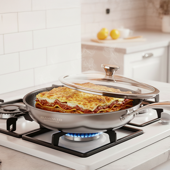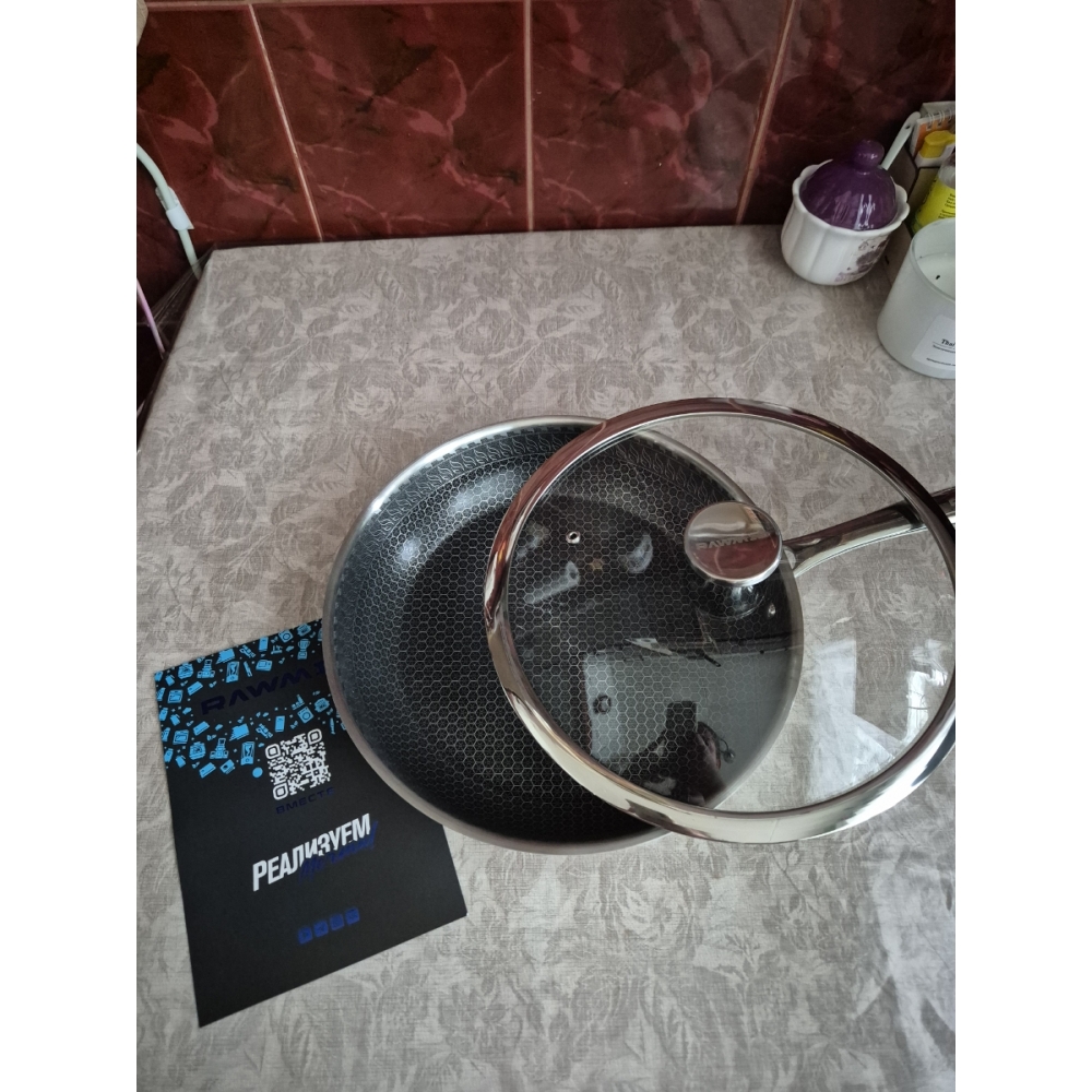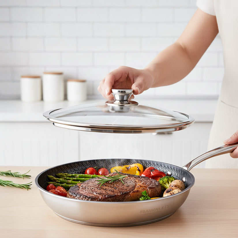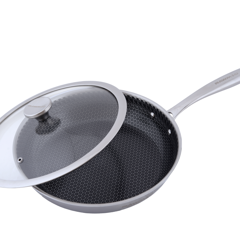 RAWMID RAP-01 — универсальная сковорода с крышкой из трёхслойной стали и керамическим антипригарным покрытием Whitford FUSION. Внутренняя поверхность усилена технологией Honeycomb, которая повышает износостойкость и защищает покрытие от царапин. Трёхслойный корпус с алюминиевым сердечником обеспечивает быстрый и ровный нагрев без горячих точек, что делает сковороду удобной как для жарки, так и для тушения или запекания.