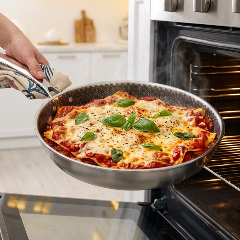 Сковорода выдерживает нагрев до 280°C и подходит для всех типов плит, включая индукцию, а крышка из закалённого стекла (до 220°C) позволяет использовать RAP-01 и в духовке. Керамическое покрытие безопасно, не содержит PFAS, PTFE, PFOA и тяжёлых металлов, а материалы корпуса остаются инертными при высоких температурах. Благодаря объёму 3,2 литра и диаметру 28 см сковорода подходит для повседневной готовки, блюд на семью и рецептов, требующих равномерного прогрева по всей поверхности.