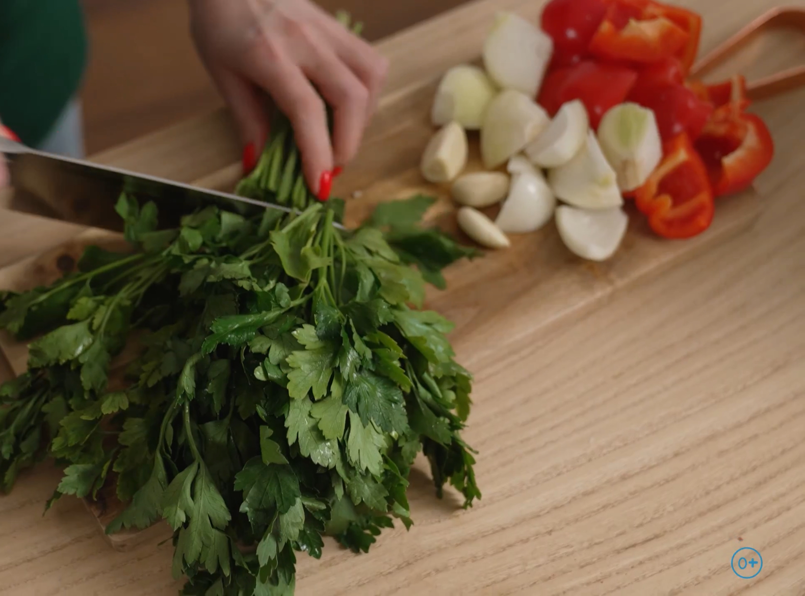 2. Нарежьте перец, лук, чеснок и зелень.